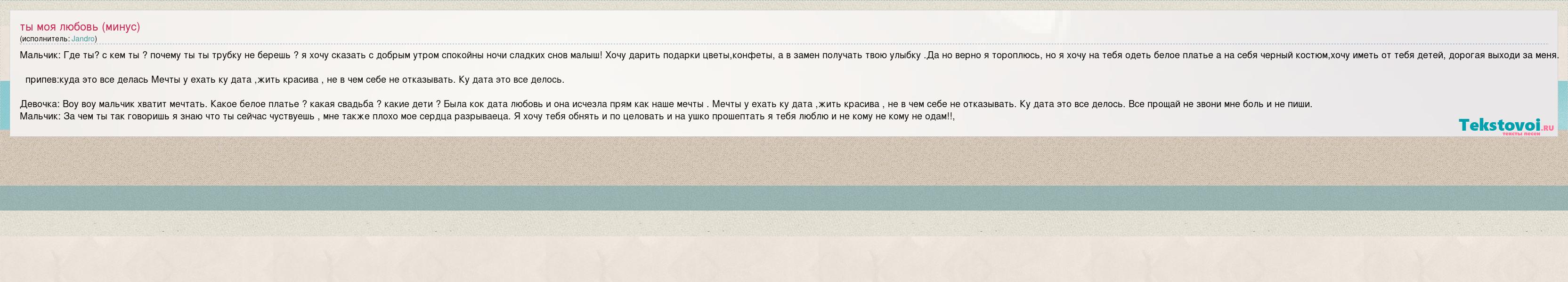 Мальчик: Где ты? с кем ты ? почему ты ты трубку не берешь ? я хочу сказать с добрым утром спокойны ночи сладких снов малыш! Хочу дарить подарки цветы,конфеты, а в замен получать твою улыбку .Да но верно я тороплюсь, но я хочу на тебя одеть белое платье а на себя черный костюм,хочу иметь от тебя детей, дорогая выходи за меня. припев:куда это все делась Мечты у ехать ку дата ,жить красива , не в чем себе не отказывать. Ку дата это все делось. Девочка: Воу воу мальчик хватит мечтать. Какое белое платье ? какая свадьба ? какие дети ? Была кок дата любовь и она исчезла прям как наше мечты . Мечты у ехать ку дата ,жить красива , не в чем себе не отказывать. Ку дата это все делось. Все прощай не звони мне боль и не пиши. Мальчик: За чем ты так говоришь я знаю что ты сейчас чуствуешь , мне также плохо мое сердца разрываеца. Я хочу тебя обнять и по целовать и на ушко прошептать я тебя люблю и не кому не кому не одам!!,