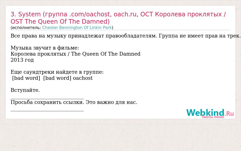 А как ты думаешь, о чем песня "3. System (группа .com/oachost, oach.ru, ОСТ Королева проклятых / OST " ?