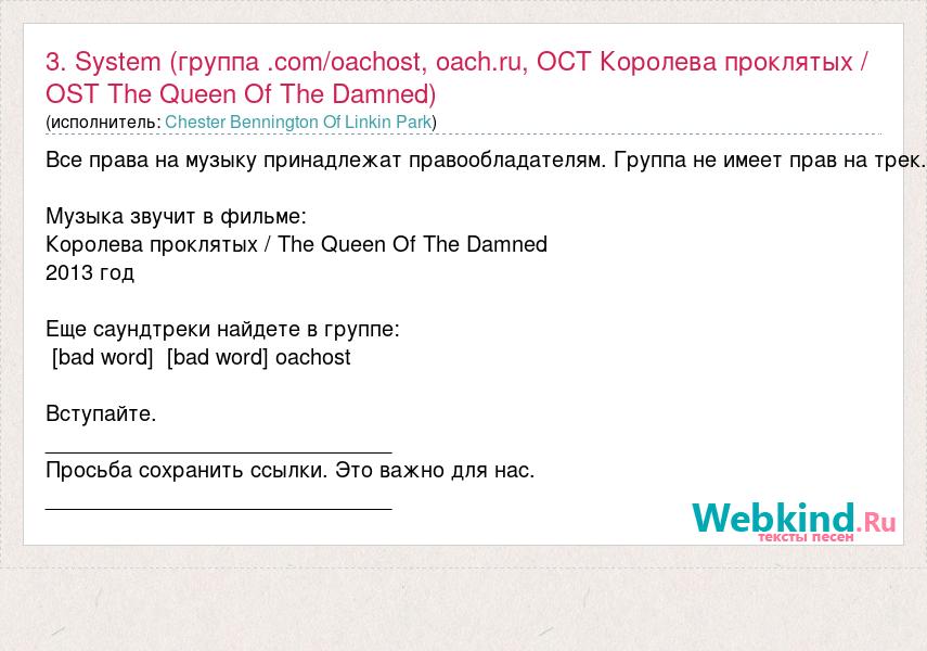 Главная→Исполнители→Chester Bennington Of Linkin Park→3. System (группа .com/oachost, oach.ru, ОСТ Королева проклятых / OST