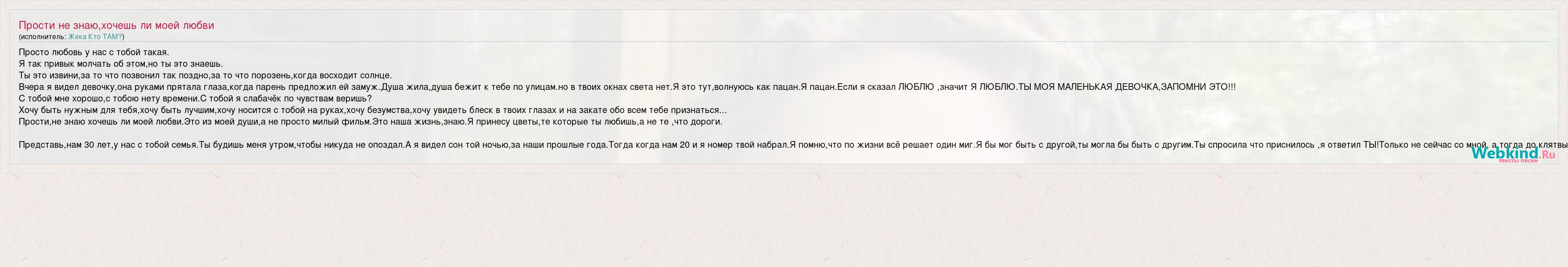 Просто любовь у нас с тобой такая. Я так привык молчать об этом,но ты это знаешь. Ты это извини,за то что позвонил так поздно,за то что порозень,когда восходит солнце. Вчера я видел девочку,она руками прятала глаза,когда парень предложил ей замуж.Душа жила,душа бежит к тебе по улицам.но в твоих окнах света нет.Я это тут,волнуюсь как пацан.Я пацан.Если я сказал ЛЮБЛЮ ,значит Я ЛЮБЛЮ.ТЫ МОЯ МАЛЕНЬКАЯ ДЕВОЧКА,ЗАПОМНИ ЭТО!!! С тобой мне хорошо,с тобою нету времени.С тобой я слабачёк по чувствам веришь? Хочу быть нужным для тебя,хочу быть лучшим,хочу носится с тобой на руках,хочу безумства,хочу увидеть блеск в твоих глазах и на закате обо всем тебе признаться... Прости,не знаю хочешь ли моей любви.Это из моей души,а не просто милый фильм.Это наша жизнь,знаю.Я принесу цветы,те которые ты любишь,а не те ,что дороги. Представь,нам 30 лет,у нас с тобой семья.Ты будишь меня утром,чтобы никуда не опоздал.А я видел сон той ночью,за наши прошлые года.Тогда когда нам 20 и я номер твой набрал.Я помню,что по жизни всё решает один миг.Я бы мог быть с другой,ты могла бы быть с другим.Ты спросила что приснилось ,я ответил ТЫ!Только не сейчас со мной, а тогда до клятвы