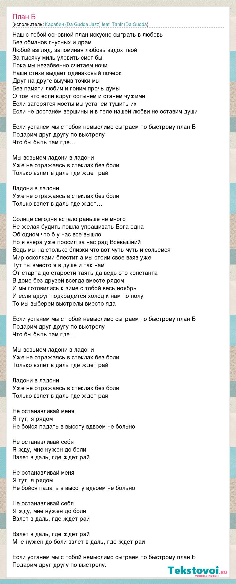 Наш с тобой основной план искусно сыграть в любовь Без обманов гнусных и драм Любой взгляд, запоминая любовь вздох твой За тысячу миль уловить смог бы Пока мы незабвенно считаем ночи Наши стихи выдает одинаковый почерк Друг на друге выучив точки мы Без памяти любим и гоним прочь думы О том что если вдруг остынем и станем чужими Если загорятся мосты мы устанем тушить их Если не достанем вершины и в теле нашей любви не оставим души Если устанем мы с тобой немыслимо сыграем по быстрому план Б Подарим друг другу по выстрелу Что бы быть там где… Мы возьмем ладони в ладони Уже не отражаясь в стеклах без боли Только взлет в даль где ждет рай Ладони в ладони Уже не отражаясь в стеклах без боли Только взлет в даль где ждет… Солнце сегодня встало раньше не много Не желая будить пошла упрашивать Бога одна Об одном что б у нас все вышло Но я вчера уже просил за нас рад Всевышний Ведь мы на столько близки что вот чуть-чуть и сольемся Мир осколками блестит а мы стоим свое взяв уже Тут ты вместо я в душе и так нам От старта до старости таять да ведь это константа В доме без друзей всегда вместе рядом И мы готовились к зиме с тобой весь ноябрь И если вдруг подкрадется холод к нам по полу То мы выберем выстрелы вместо яда Если устанем мы с тобой немыслимо сыграем по быстрому план Б Подарим друг другу по выстрелу Что бы быть там где… Мы возьмем ладони в ладони Уже не отражаясь в стеклах без боли Только взлет в даль где ждет рай Ладони в ладони Уже не отражаясь в стеклах без боли Только взлет в даль где ждет рай Не останавливай меня Я тут, я рядом Не бойся падать в высоту вдвоем не больно Не останавливай себя Я жду, мне нужен до боли Взлет в даль, где ждет рай Не останавливай меня Я тут, я рядом Не бойся падать в высоту вдвоем не больно Не останавливай себя Я жду, мне нужен до боли Взлет в даль, где ждет рай Взлет в даль, где ждет рай Мне нужен до боли взлет в даль, где ждет рай Если устанем мы с тобой немыслимо сыграем по быстрому план Б Подарим друг другу по выстрелу.