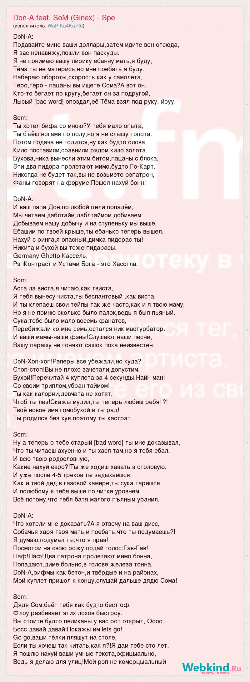 DoN-A: Подавайте мине ваши доллары,затем идите вон отсюда, Я вас ненавижу,пошли вон паскуды. Я не понимаю вашу лирику ебанну мать,я буду, Тёма ты не матерись,но мне поебать я буду. Набераю обороты,скорость как у самолёта, Теро,теро - пацаны вы ищете Сома?А вот он. Кто-то бегает по кругу,бегает он за подругой, Лысый [bad word] опоздал,её Тёма взял под руку. йоуу. Som: Ты хотел бифа со мною?У тебя мало опыта, Ты бъёш ногами по полу,но я не слышу топота. Потом подача не годится,ну как будто олова, Кило поставили,сравнили рядом кило золота. Бухова,ника вынесли этим битом,пацаны с блока, Эти два пидора пролетают мимо,будто Го-Карт. Никогда не будет так,вы не возьмете рэпатрон, Фаны говорят на форуме:Пошол нахуй бонн! DoN-A: И ваш папа Дон,по любой цели попадём, Мы читаем даблтайм,даблтаймом добиваем. Добываем нашу добычу и на ступеньку мы выше, Ебашим по твоей крыше,ты ебанько теперь вышел. Нахуй с ринга,я опасный,димка пидорас ты! Никита и бухой вы тоже пидарасы. Germany Ghetto Кассель, РэпКонтраст и Устами Бога - это Хасстла. Som: Аста ла виста,я читаю,как твиста, Я тебя вынесу чиста,ты беспантовый ,как виста. И ты клепаеш свои тейпы так же часто,как и я твою маму, Но я не помню сколько было палок,ведь я был пьяный. Сука,тебе было мало восемь фанатов, Перебижали ко мне семь,остался ник мастурбатор. И ваши мамы-наши фэны!Слушают наши песни, Вашу парашу не гоняют,сашок пока неизвестен. DoN-Хоп-хоп!Рэперы все убежали,но куда? Стоп-стоп!Вы не плохо зачетали,допустим. Бухой!Перечитай 4 куплета за 4 секунды.Найн ман! Со своим триплом,убран таймом! Ты как калории,девчата не хотят, Чтоб ты лез!Скажы мудил,ты теперь любиш ребят?! Твоё новое имя гомобухой,и ты рад! Ты родился без хуя,поэтому ты кастрат. Som: Ну а теперь о тебе старый [bad word] ты мне доказывал, Что ты читаеш ахуенно и ты хасл там,но я тебя ебал. И всю твою родословную, Какие нахуй евро?!Ты же ходиш хавать в столовую. И уже после 4-5 треков ты задыхаешся, Как и твой дед в газовой камере,ты сука таришся. И полюбому я тебя выше по читке,уровнем, Всё потому,что тебя батя малого пъяным уранил. DoN-A: Что хотели мне доказать?А я отвечу на ваш дисс, Собачья харя твоя мать,и поебать,что ты подумаешь?! Я думаю,подумал ты,что я прав! Посмотри на свою рожу,подай голос:Гав-Гав! Паф!Паф!Два патрона пролетают мимо бонна, Попадают,диме больно,в голове железа тонна. DoN-A,рифмы как бетон,и твёрдые и на районах, Мой куплет пришол к концу,слушай дальше дядю Сома! Som: Дядя Сом,бьёт тебя как будто бест оф, Флоу разбивает этих лохов быстроу. Вы стоите будто пеликаны,у вас рот открыт, Оооо. Босс давай давай!Покажы им lets go! Go go,ваши тёлки пляшут на столе, Если ты хочеш так читать,как я?!Я дам тебе сто лет. Я пошлю нахуй ваши умные текста,офицыально, Ведь я делаю для улиц!Мой рэп не комерцыальный