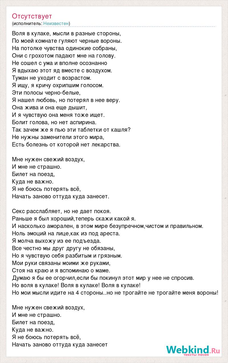 Воля в кулаке, мысли в разные стороны, По моей комнате гуляют черные вороны. На потолке чувства одинокие собраны, Они с грохотом падают мне на голову. Не сошел с ума и вполне осознанно Я вдыхаю этот яд вместе с воздухом. Туман не уходит с возрастом. Я ищу, я кричу охрипшим голосом. Эти полосы черно-белые, Я нашел любовь, но потерял в нее веру. Она жива и она еще дышит, И я чувствую она меня тоже ищет. Болит голова, но нет аспирина. Так зачем же я пью эти таблетки от кашля? Не нужны заменители этого мира, Есть болезнь от которой нет лекарства. Мне нужен свежий воздух, И мне не страшно. Билет на поезд, Куда не важно. Я не боюсь потерять всё, Начать заново оттуда куда занесет. Секс расслабляет, но не дает покоя. Раньше я был хороший,теперь скажи какой я. И насколько аморален, в этом мире безупречном,чистом и правильном. Ноль эмоций на лице,как из под ареста. Я молча выхожу из ее подъезда. Все честно мы друг другу не обязаны, Но я чувствую себя разбитым и грязным. Мои руки связаны моими же руками, Стоя на краю и я вспоминаю о маме. Думаю я бы ее огорчил,если бы покинул этот мир у нее не спросив. Но воля в кулаке! Воля в кулаке! Воля в кулаке! Но мои мысли идите на 4 стороны..но не трогайте не трогайте меня вороны! Мне нужен свежий воздух, И мне не страшно. Билет на поезд, Куда не важно. Я не боюсь потерять всё, Начать заново оттуда куда занесет