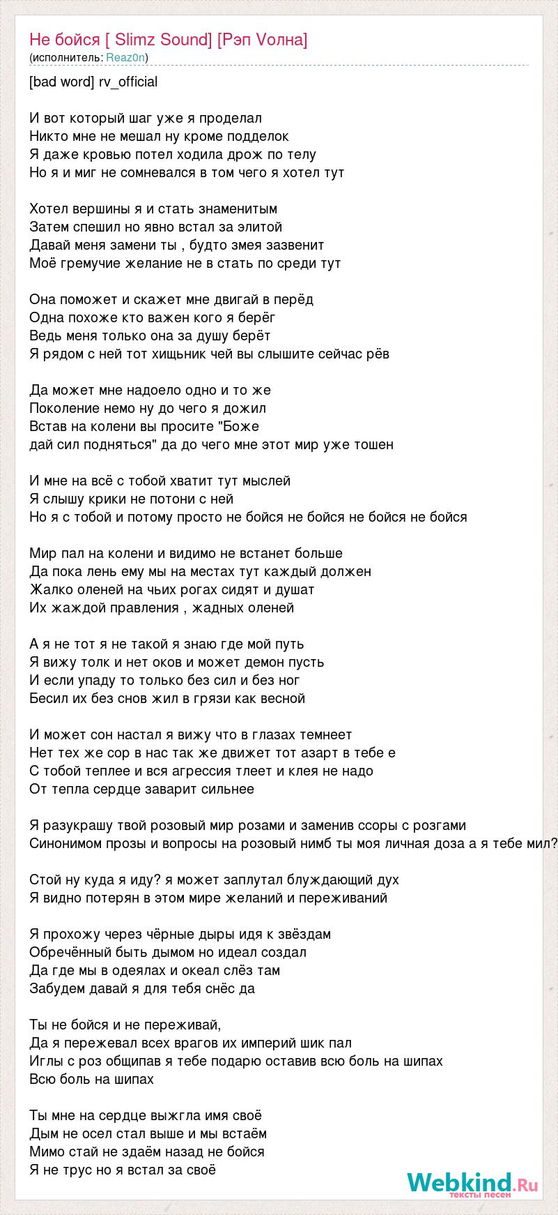 [bad word] rv_official И вот который шаг уже я проделал Никто мне не мешал ну кроме подделок Я даже кровью потел ходила дрож по телу Но я и миг не сомневался в том чего я хотел тут Хотел вершины я и стать знаменитым Затем спешил но явно встал за элитой Давай меня замени ты , будто змея зазвенит Моё гремучие желание не в стать по среди тут Она поможет и скажет мне двигай в перёд Одна похоже кто важен кого я берёг Ведь меня только она за душу берёт Я рядом с ней тот хищьник чей вы слышите сейчас рёв Да может мне надоело одно и то же Поколение немо ну до чего я дожил Встав на колени вы просите "Боже дай сил подняться" да до чего мне этот мир уже тошен И мне на всё с тобой хватит тут мыслей Я слышу крики не потони с ней Но я с тобой и потому просто не бойся не бойся не бойся не бойся Мир пал на колени и видимо не встанет больше Да пока лень ему мы на местах тут каждый должен Жалко оленей на чьих рогах сидят и душат Их жаждой правления , жадных оленей А я не тот я не такой я знаю где мой путь Я вижу толк и нет оков и может демон пусть И если упаду то только без сил и без ног Бесил их без снов жил в грязи как весной И может сон настал я вижу что в глазах темнеет Нет тех же сор в нас так же движет тот азарт в тебе е С тобой теплее и вся агрессия тлеет и клея не надо От тепла сердце заварит сильнее Я разукрашу твой розовый мир розами и заменив ссоры с розгами Синонимом прозы и вопросы на розовый нимб ты моя личная доза а я тебе мил? Стой ну куда я иду? я может заплутал блуждающий дух Я видно потерян в этом мире желаний и переживаний Я прохожу через чёрные дыры идя к звёздам Обречённый быть дымом но идеал создал Да где мы в одеялах и океал слёз там Забудем давай я для тебя снёс да Ты не бойся и не переживай, Да я пережевал всех врагов их империй шик пал Иглы с роз общипав я тебе подарю оставив всю боль на шипах Всю боль на шипах Ты мне на сердце выжгла имя своё Дым не осел стал выше и мы встаём Мимо стай не здаём назад не бойся Я не трус но я встал за своё