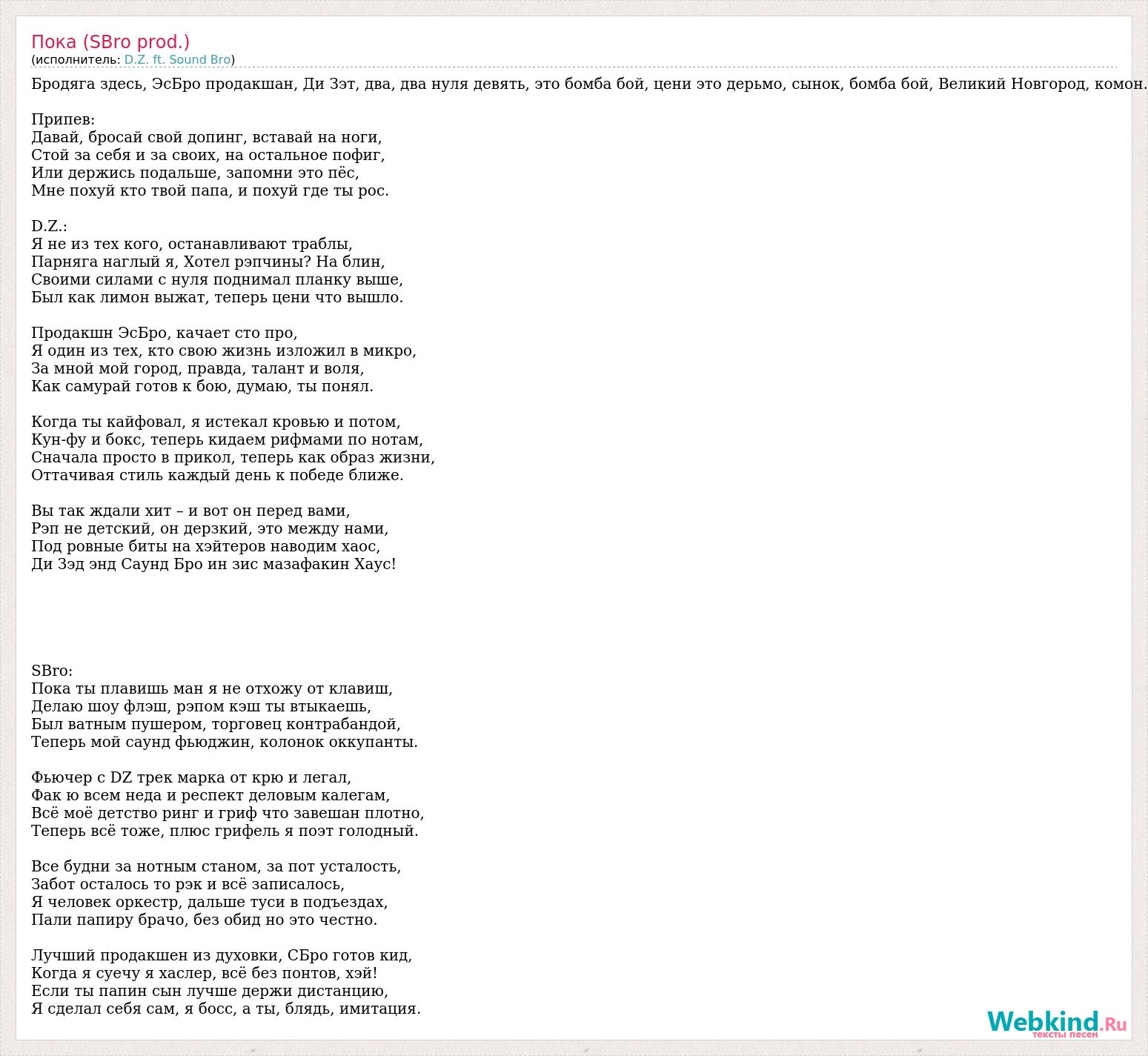 Бродяга здесь, ЭсБро продакшан, Ди Зэт, два, два нуля девять, это бомба бой, цени это дерьмо, сынок, бомба бой, Великий Новгород, комон. Припев: Давай, бросай свой допинг, вставай на ноги, Стой за себя и за своих, на остальное пофиг, Или держись подальше, запомни это пёс, Мне похуй кто твой папа, и похуй где ты рос. D.Z.: Я не из тех кого, останавливают траблы, Парняга наглый я, Хотел рэпчины? На блин, Своими силами с нуля поднимал планку выше, Был как лимон выжат, теперь цени что вышло. Продакшн ЭсБро, качает сто про, Я один из тех, кто свою жизнь изложил в микро, За мной мой город, правда, талант и воля, Как самурай готов к бою, думаю, ты понял. Когда ты кайфовал, я истекал кровью и потом, Кун-фу и бокс, теперь кидаем рифмами по нотам, Сначала просто в прикол, теперь как образ жизни, Оттачивая стиль каждый день к победе ближе. Вы так ждали хит – и вот он перед вами, Рэп не детский, он дерзкий, это между нами, Под ровные биты на хэйтеров наводим хаос, Ди Зэд энд Саунд Бро ин зис мазафакин Хаус! SBro: Пока ты плавишь ман я не отхожу от клавиш, Делаю шоу флэш, рэпом кэш ты втыкаешь, Был ватным пушером, торговец контрабандой, Теперь мой саунд фьюджин, колонок оккупанты. Фьючер с DZ трек марка от крю и легал, Фак ю всем неда и респект деловым калегам, Всё моё детство ринг и гриф что завешан плотно, Теперь всё тоже, плюс грифель я поэт голодный. Все будни за нотным станом, за пот усталость, Забот осталось то рэк и всё записалось, Я человек оркестр, дальше туси в подъездах, Пали папиру брачо, без обид но это честно. Лучший продакшен из духовки, СБро готов кид, Когда я суечу я хаслер, всё без понтов, хэй! Если ты папин сын лучше держи дистанцию, Я сделал себя сам, я босс, а ты, блядь, имитация.