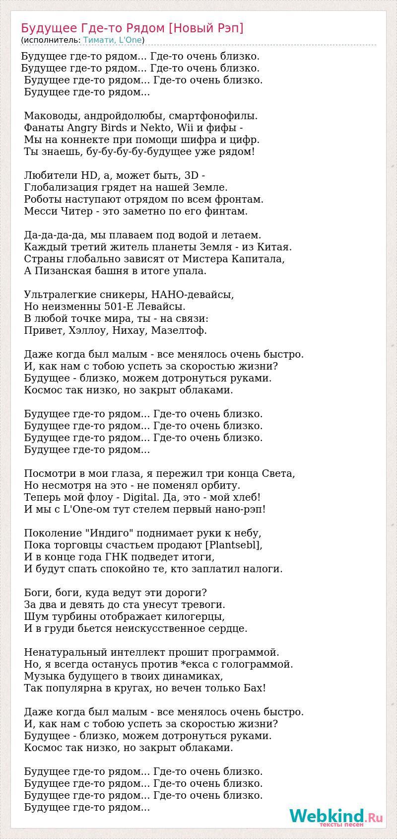 Будущее где-то рядом... Где-то очень близко. Будущее где-то рядом... Где-то очень близко. Будущее где-то рядом... Где-то очень близко. Будущее где-то рядом... Маководы, андройдолюбы, смартфонофилы. Фанаты Angry Birds и Nekto, Wii и фифы - Мы на коннекте при помощи шифра и цифр. Ты знаешь, бу-бу-бу-бу-будущее уже рядом! Любители HD, а, может быть, 3D - Глобализация грядет на нашей Земле. Роботы наступают отрядом по всем фронтам. Месси Читер - это заметно по его финтам. Да-да-да-да, мы плаваем под водой и летаем. Каждый третий житель планеты Земля - из Китая. Страны глобально зависят от Мистера Капитала, А Пизанская башня в итоге упала. Ультралегкие сникеры, НАНО-девайсы, Но неизменны 501-Е Левайсы. В любой точке мира, ты - на связи: Привет, Хэллоу, Нихау, Мазелтоф. Даже когда был малым - все менялось очень быстро. И, как нам с тобою успеть за скоростью жизни? Будущее - близко, можем дотронуться руками. Космос так низко, но закрыт облаками. Будущее где-то рядом... Где-то очень близко. Будущее где-то рядом... Где-то очень близко. Будущее где-то рядом... Где-то очень близко. Будущее где-то рядом... Посмотри в мои глаза, я пережил три конца Света, Но несмотря на это - не поменял орбиту. Теперь мой флоу - Digital. Да, это - мой хлеб! И мы с L'One-ом тут стелем первый нано-рэп! Поколение "Индиго" поднимает руки к небу, Пока торговцы счастьем продают [Plantsebl], И в конце года ГНК подведет итоги, И будут спать спокойно те, кто заплатил налоги. Боги, боги, куда ведут эти дороги? За два и девять до ста унесут тревоги. Шум турбины отображает килогерцы, И в груди бьется неискусственное сердце. Ненатуральный интеллект прошит программой. Но, я всегда останусь против *екса с голограммой. Музыка будущего в твоих динамиках, Так популярна в кругах, но вечен только Бах! Даже когда был малым - все менялось очень быстро. И, как нам с тобою успеть за скоростью жизни? Будущее - близко, можем дотронуться руками. Космос так низко, но закрыт облаками. Будущее где-то рядом... Где-то очень близко. Будущее где-то рядом... Где-то очень близко. Будущее где-то рядом... Где-то очень близко. Будущее где-то рядом...