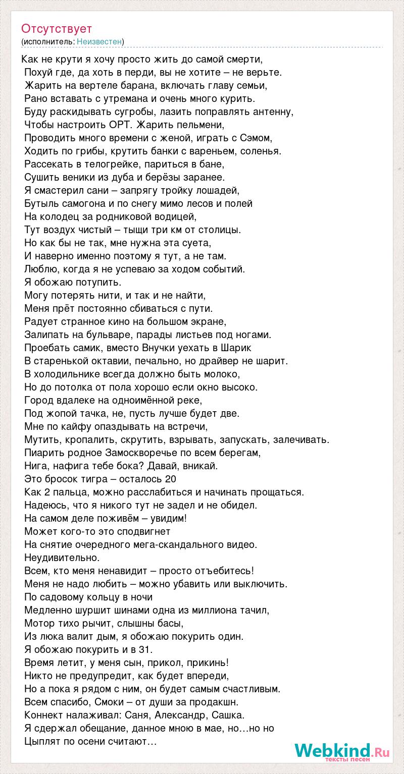 Как не крути я хочу просто жить до самой смерти, Похуй где, да хоть в перди, вы не хотите – не верьте. Жарить на вертеле барана, включать главу семьи, Рано вставать с утремана и очень много курить. Буду раскидывать сугробы, лазить поправлять антенну, Чтобы настроить ОРТ. Жарить пельмени, Проводить много времени с женой, играть с Сэмом, Ходить по грибы, крутить банки с вареньем, соленья. Рассекать в телогрейке, париться в бане, Сушить веники из дуба и берёзы заранее. Я смастерил сани – запрягу тройку лошадей, Бутыль самогона и по снегу мимо лесов и полей На колодец за родниковой водицей, Тут воздух чистый – тыщи три км от столицы. Но как бы не так, мне нужна эта суета, И наверно именно поэтому я тут, а не там. Люблю, когда я не успеваю за ходом событий. Я обожаю потупить. Могу потерять нити, и так и не найти, Меня прёт постоянно сбиваться с пути. Радует странное кино на большом экране, Залипать на бульваре, парады листьев под ногами. Проебать самик, вместо Внучки уехать в Шарик В старенькой октавии, печально, но драйвер не шарит. В холодильнике всегда должно быть молоко, Но до потолка от пола хорошо если окно высоко. Город вдалеке на одноимённой реке, Под жопой тачка, не, пусть лучше будет две. Мне по кайфу опаздывать на встречи, Мутить, кропалить, скрутить, взрывать, запускать, залечивать. Пиарить родное Замоскворечье по всем берегам, Нига, нафига тебе бока? Давай, вникай. Это бросок тигра – осталось 20 Как 2 пальца, можно расслабиться и начинать прощаться. Надеюсь, что я никого тут не задел и не обидел. На самом деле поживём – увидим! Может кого-то это сподвигнет На снятие очередного мега-скандального видео. Неудивительно. Всем, кто меня ненавидит – просто отъебитесь! Меня не надо любить – можно убавить или выключить. По садовому кольцу в ночи Медленно шуршит шинами одна из миллиона тачил, Мотор тихо рычит, слышны басы, Из люка валит дым, я обожаю покурить один. Я обожаю покурить и в 31. Время летит, у меня сын, прикол, прикинь! Никто не предупредит, как будет впереди, Но а пока я рядом с ним, он будет самым счастливым. Всем спасибо, Смоки – от души за продакшн. Коннект налаживал: Саня, Александр, Сашка. Я сдержал обещание, данное мною в мае, но…но но Цыплят по осени считают…