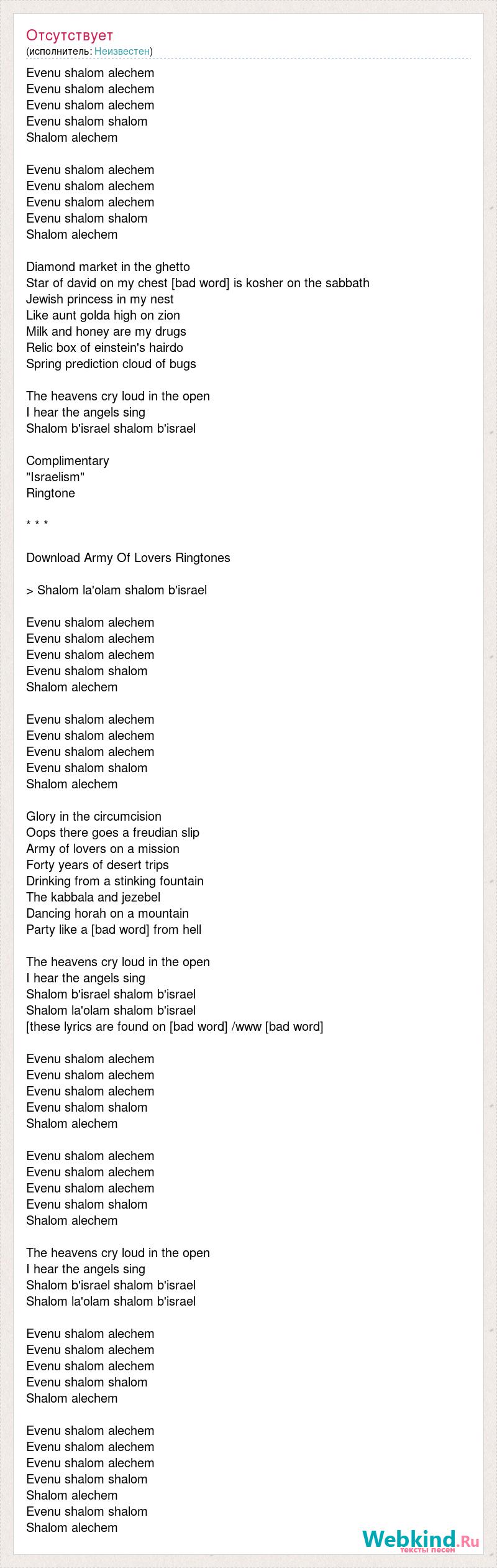 Evenu shalom alechem Evenu shalom alechem Evenu shalom alechem Evenu shalom shalom Shalom alechem Evenu shalom alechem Evenu shalom alechem Evenu shalom alechem Evenu shalom shalom Shalom alechem Diamond market in the ghetto Star of david on my chest [bad word] is kosher on the sabbath Jewish princess in my nest Like aunt golda high on zion Milk and honey are my drugs Relic box of einstein's hairdo Spring prediction cloud of bugs The heavens cry loud in the open I hear the angels sing Shalom b'israel shalom b'israel Complimentary "Israelism" Ringtone * * * Download Army Of Lovers Ringtones > Shalom la'olam shalom b'israel Evenu shalom alechem Evenu shalom alechem Evenu shalom alechem Evenu shalom shalom Shalom alechem Evenu shalom alechem Evenu shalom alechem Evenu shalom alechem Evenu shalom shalom Shalom alechem Glory in the circumcision Oops there goes a freudian slip Army of lovers on a mission Forty years of desert trips Drinking from a stinking fountain The kabbala and jezebel Dancing horah on a mountain Party like a [bad word] from hell The heavens cry loud in the open I hear the angels sing Shalom b'israel shalom b'israel Shalom la'olam shalom b'israel [these lyrics are found on [bad word] /www [bad word] Evenu shalom alechem Evenu shalom alechem Evenu shalom alechem Evenu shalom shalom Shalom alechem Evenu shalom alechem Evenu shalom alechem Evenu shalom alechem Evenu shalom shalom Shalom alechem The heavens cry loud in the open I hear the angels sing Shalom b'israel shalom b'israel Shalom la'olam shalom b'israel Evenu shalom alechem Evenu shalom alechem Evenu shalom alechem Evenu shalom shalom Shalom alechem Evenu shalom alechem Evenu shalom alechem Evenu shalom alechem Evenu shalom shalom Shalom alechem Evenu shalom shalom Shalom alechem