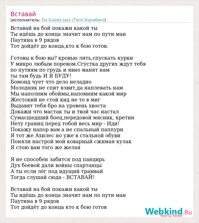 Вставай на бой покажи какой ты Ты идёшь до конца значит нам по пути ман Паутина в 9 рядов Тот дойдёт до конца,кто к бою готов. Готовы к бою вы? кровью лить,спускать курки У микро любым поревом.Сгустка других ждут тебя по путиям по грудь и явно манят нам ты там будь И Я БУДУ! Бомонд чует что дело неладно Молодняк не спит язвит,да наплевать нам Мы наполним обоймы,напомним какой мир Жестокий не стой кид не то в миг Выдавят тебя бро на уровень хвоста Докажи что мастак ты и твой час настал Сумасшедший боец,передовой мясник, кретин Нету границ перед тобой весь мир - Иди! Покажу напор вам а не спальный паппури Я тот же Ахилес но уже в стальной обуви Поняли настрой мой коварный сжимая кулак Я стою вам того же желая Я не способен забится под панцирь Дух боевой дали войны спартанцы А ты если лёг под идущий трамвай Тогда слушай сюда - ВСТАВАЙ! Вставай на бой покажи какой ты Ты идёшь до конца значит нам по пути ман Паутина в 9 рядов Тот дойдёт до конца кто к бою готов