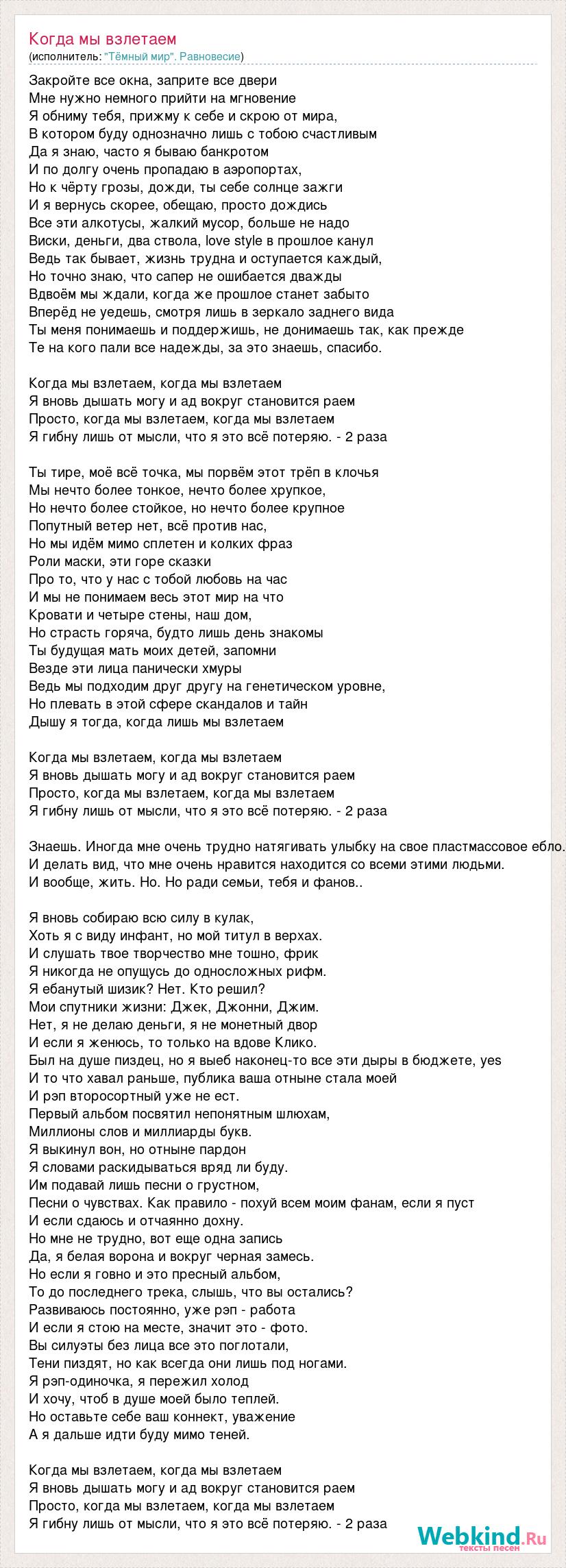 Закройте все окна, заприте все двери Мне нужно немного прийти на мгновение Я обниму тебя, прижму к себе и скрою от мира, В котором буду однозначно лишь с тобою счастливым Да я знаю, часто я бываю банкротом И по долгу очень пропадаю в аэропортах, Но к чёрту грозы, дожди, ты себе солнце зажги И я вернусь скорее, обещаю, просто дождись Все эти алкотусы, жалкий мусор, больше не надо Виски, деньги, два ствола, love style в прошлое канул Ведь так бывает, жизнь трудна и оступается каждый, Но точно знаю, что сапер не ошибается дважды Вдвоём мы ждали, когда же прошлое станет забыто Вперёд не уедешь, смотря лишь в зеркало заднего вида Ты меня понимаешь и поддержишь, не донимаешь так, как прежде Те на кого пали все надежды, за это знаешь, спасибо. Когда мы взлетаем, когда мы взлетаем Я вновь дышать могу и ад вокруг становится раем Просто, когда мы взлетаем, когда мы взлетаем Я гибну лишь от мысли, что я это всё потеряю. - 2 раза Ты тире, моё всё точка, мы порвём этот трёп в клочья Мы нечто более тонкое, нечто более хрупкое, Но нечто более стойкое, но нечто более крупное Попутный ветер нет, всё против нас, Но мы идём мимо сплетен и колких фраз Роли маски, эти горе сказки Про то, что у нас с тобой любовь на час И мы не понимаем весь этот мир на что Кровати и четыре стены, наш дом, Но страсть горяча, будто лишь день знакомы Ты будущая мать моих детей, запомни Везде эти лица панически хмуры Ведь мы подходим друг другу на генетическом уровне, Но плевать в этой сфере скандалов и тайн Дышу я тогда, когда лишь мы взлетаем Когда мы взлетаем, когда мы взлетаем Я вновь дышать могу и ад вокруг становится раем Просто, когда мы взлетаем, когда мы взлетаем Я гибну лишь от мысли, что я это всё потеряю. - 2 раза Знаешь. Иногда мне очень трудно натягивать улыбку на свое пластмассовое ебло. И делать вид, что мне очень нравится находится со всеми этими людьми. И вообще, жить. Но. Но ради семьи, тебя и фанов.. Я вновь собираю всю силу в кулак, Хоть я с виду инфант, но мой титул в верхах. И слушать твое творчество мне тошно, фрик Я никогда не опущусь до односложных рифм. Я ебанутый шизик? Нет. Кто решил? Мои спутники жизни: Джек, Джонни, Джим. Нет, я не делаю деньги, я не монетный двор И если я женюсь, то только на вдове Клико. Был на душе пиздец, но я выеб наконец-то все эти дыры в бюджете, yes И то что хавал раньше, публика ваша отныне стала моей И рэп второсортный уже не ест. Первый альбом посвятил непонятным шлюхам, Миллионы слов и миллиарды букв. Я выкинул вон, но отныне пардон Я словами раскидываться вряд ли буду. Им подавай лишь песни о грустном, Песни о чувствах. Как правило - похуй всем моим фанам, если я пуст И если сдаюсь и отчаянно дохну. Но мне не трудно, вот еще одна запись Да, я белая ворона и вокруг черная замесь. Но если я говно и это пресный альбом, То до последнего трека, слышь, что вы остались? Развиваюсь постоянно, уже рэп - работа И если я стою на месте, значит это - фото. Вы силуэты без лица все это поглотали, Тени пиздят, но как всегда они лишь под ногами. Я рэп-одиночка, я пережил холод И хочу, чтоб в душе моей было теплей. Но оставьте себе ваш коннект, уважение А я дальше идти буду мимо теней. Когда мы взлетаем, когда мы взлетаем Я вновь дышать могу и ад вокруг становится раем Просто, когда мы взлетаем, когда мы взлетаем Я гибну лишь от мысли, что я это всё потеряю. - 2 раза