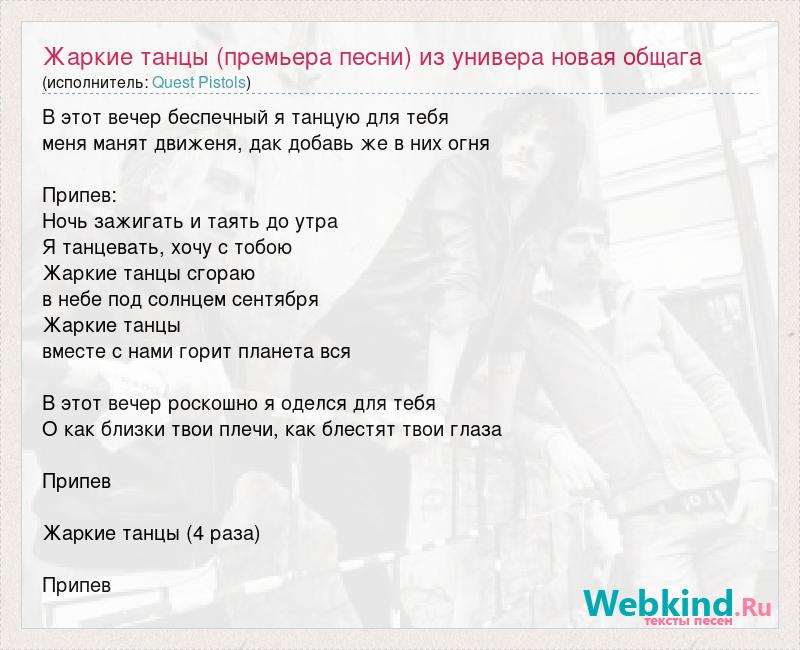 В этот вечер беспечный я танцую для тебя меня манят движеня, дак добавь же в них огня Припев: Ночь зажигать и таять до утра Я танцевать, хочу с тобою Жаркие танцы сгораю в небе под солнцем сентября Жаркие танцы вместе с нами горит планета вся В этот вечер роскошно я оделся для тебя О как близки твои плечи, как блестят твои глаза Припев Жаpкие танцы (4 раза) Припев