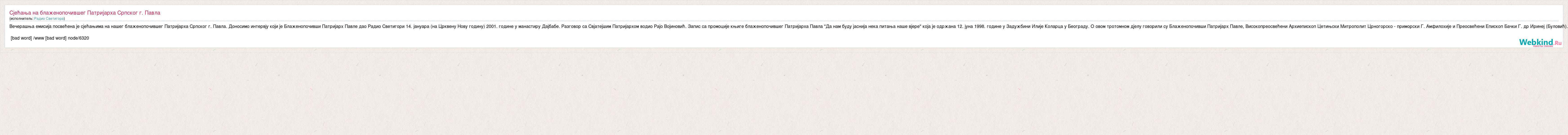 Вечерашња емисија посвећена је сјећањима на нашег блаженопочившег Патријарха Српског г. Павла. Доносимо интервју који је Блаженопочивши Патријарх Павле дао Радио Светигори 14. јануара (на Црквену Нову годину) 2001. године у манастиру Дајбабе. Разговор са Свјатејшим Патријархом водио Рајо Војиновић. Запис са промоције књиге блаженопочившег Патријарха Павла "Да нам буду јаснија нека питања наше вјере" која је одржана 12. јуна 1998. године у Задужбини Илије Коларца у Београду. О овом тротомном дјелу говорили су Блаженопочивши Патријарх Павле, Високопреосвећени Архиепископ Цетињски Митрополит Црногорско - приморски Г. Амфилохије и Преосвећени Епископ Бачки Г. др Иринеј (Буловић). [bad word] /www [bad word] node/6320
