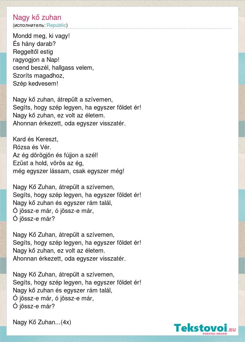 Mondd meg, ki vagy! És hány darab? Reggeltől estig ragyogjon a Nap! csend beszél, hallgass velem, Szoríts magadhoz, Szép kedvesem! Nagy kő zuhan, átrepült a szívemen, Segíts, hogy szép legyen, ha egyszer földet ér! Nagy kő zuhan, ez volt az életem. Ahonnan érkezett, oda egyszer visszatér. Kard és Kereszt, Rózsa és Vér. Az ég dörögjön és fújjon a szél! Ezüst a hold, vörös az ég, még egyszer lássam, csak egyszer még! Nagy Kő Zuhan, átrepült a szívemen, Segíts, hogy szép legyen, ha egyszer földet ér! Nagy kő zuhan és egyszer rám talál, Ó jössz-e már, ó jössz-e már, Ó jössz-e már? Nagy Kő Zuhan, átrepült a szívemen, Segíts, hogy szép legyen, ha egyszer földet ér! Nagy kő zuhan, ez volt az életem. Ahonnan érkezett, oda egyszer visszatér. Nagy Kő Zuhan, átrepült a szívemen, Segíts, hogy szép legyen, ha egyszer földet ér! Nagy kő zuhan és egyszer rám talál, Ó jössz-e már, ó jössz-e már, Ó jössz-e már? Nagy Kő Zuhan...(4x)