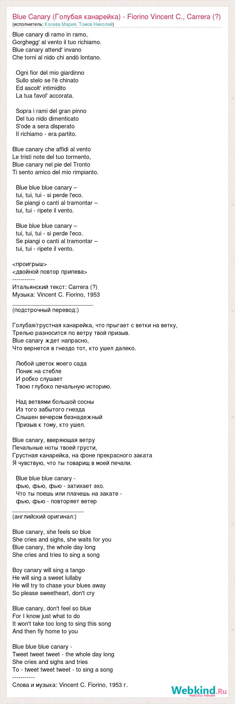 Blue canary di ramo in ramo, Gorghegg' al vento il tuo richiamo. Blue canary attend' invano Che torni al nido chi andò lontano. Ogni fior del mio giardinno Sullo stelo se l'è chinato Ed ascolt' intimidito La tua favol' accorata. Sopra i rami del gran pinno Del tuo nido dimenticato S'ode a sera disperato Il richiamo - era partito. Blue canary che affidi al vento Le tristi note del tuo tormento, Blue canary nel pie del Tronto Ti sento amico del mio rimpianto. Blue blue blue canary – tui, tui, tui - si perde l'eco. Se piangi o canti al tramontar – tui, tui - ripete il vento. Blue blue blue canary – tui, tui, tui - si perde l'eco. Se piangi o canti al tramontar – tui, tui - ripete il vento. <проигрыш> <двойной повтор припева> ----------- Итальянский текст: Carrera (?) Музыка: Vincent C. Fiorino, 1953 _________________________ (подстрочный перевод:) Голубая/грустная канарейка, что прыгает с ветки на ветку, Трелью разносится по ветру твой призыв. Blue canary ждет напрасно, Что вернется в гнездо тот, кто ушел далеко. Любой цветок моего сада Поник на стебле И робко слушает Твою глубоко печальную историю. Над ветвями большой сосны Из того забытого гнезда Слышен вечером безнадежный Призыв к тому, кто ушел. Blue canary, вверяющая ветру Печальные ноты твоей грусти, Грустная канарейка, на фоне прекрасного заката Я чувствую, что ты товарищ в моей печали. Blue blue blue canary - фью, фью, фью - затихает эхо. Что ты поешь или плачешь на закате - фью, фью - повторяет ветер ______________________ (английский оригинал:) Blue canary, she feels so blue She cries and sighs, she waits for you Blue canary, the whole day long She cries and tries to sing a song Boy canary will sing a tango He will sing a sweet lullaby He will try to chase your blues away So please sweetheart, don't cry Blue canary, don't feel so blue For I know just what to do It won't take too long to sing this song And then fly home to you Blue blue blue canary - Tweet tweet tweet - the whole day long She cries and sighs and tries To - tweet tweet tweet - to sing a song ----------- Слова и музыка: Vincent C. Fiorino, 1953 г.