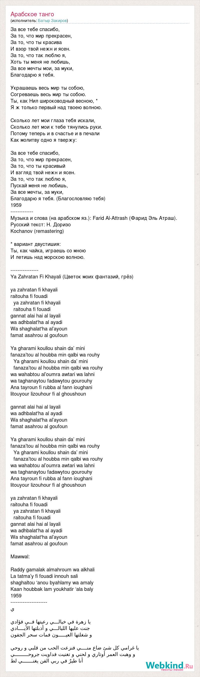 За все тебе спасибо, За то, что мир прекрасен, За то, что ты красива И взор твой нежн и ясен. За то, что так люблю я, Хоть ты меня не любишь, За все мечты мои, за муки, Благодарю я тебя. Украшаешь весь мир ты собою, Согреваешь весь мир ты собою. Ты, как Нил широководный весною, * Я ж только первый над твоею волною. Сколько лет мои глаза тебя искали, Сколько лет мои к тебе тянулись руки. Потому теперь и в счастье и в печали Как молитву одно я твержу: За все тебе спасибо, За то, что мир прекрасен, За то, что ты красивый И взгляд твой нежн и ясен. За то, что так люблю я, Пускай меня не любишь, За все мечты, за муки, Благодарю я тебя. (Благословляю тебя) 1959 ------------- Музыка и слова (на арабском яз.): Farid Al-Attrash (Фарид Эль Атраш). Русский текст: Н. Доризо Kochanov (remastering) * вариант двустишия: Ты, как чайка, играешь со мною И летишь над морскою волною. ---------------- Ya Zahratan Fi Khayali (Цветок моих фантазий, грёз) ya zahratan fi khayali raitouha fi fouadi ya zahratan fi khayali raitouha fi fouadi gannat alai hai al layali wa adhbalat'ha al ayadi Wa shaghalat'ha al’ayoun famat asahrou al goufoun Ya gharami koullou shain da’ mini fanaza’tou al houbba min qalbi wa rouhy Ya gharami koullou shain da’ mini fanaza’tou al houbba min qalbi wa rouhy wa wahabtou al’oumra awtari wa lahni wa taghanaytou fadawytou gourouhy Ana tayroun fi rubba al fann ioughani litouyour lizouhour fi al ghoushoun gannat alai hai al layali wa adhbalat'ha al ayadi Wa shaghalat'ha al’ayoun famat asahrou al goufoun Ya gharami koullou shain da’ mini fanaza’tou al houbba min qalbi wa rouhy Ya gharami koullou shain da’ mini fanaza’tou al houbba min qalbi wa rouhy wa wahabtou al’oumra awtari wa lahni wa taghanaytou fadawytou gourouhy Ana tayroun fi rubba al fann ioughani litouyour lizouhour fi al ghoushoun ya zahratan fi khayali raitouha fi fouadi ya zahratan fi khayali raitouha fi fouadi gannat alai hai al layali wa adhbalat'ha al ayadi Wa shaghalat'ha al’ayoun famat asahrou al goufoun Mawwal: Raddy gamalak almahroum wa alkhali La tatma’y fi fouadi innouh sali shaghaltou ‘anou byahlamy wa amaly Kaan houbbak lam youkhatir ‘ala baly 1959 --------------------- ي يا زهرة في خيالـــي رعيتها فــي فؤادي جنت عليها الليالـــي و أذبلتها الأيــــادي و شغلتها العيـــــون فمات سحر الجفون يا غرامي كل شئ ضاع منــــي فنزعت الحب من قلبي و روحي و وهبت العمر أوتاري و لحني و تغنيت فداويت جروحـــــــــي أنا طيرٌ في ربي الفن يغنـــــــي لط