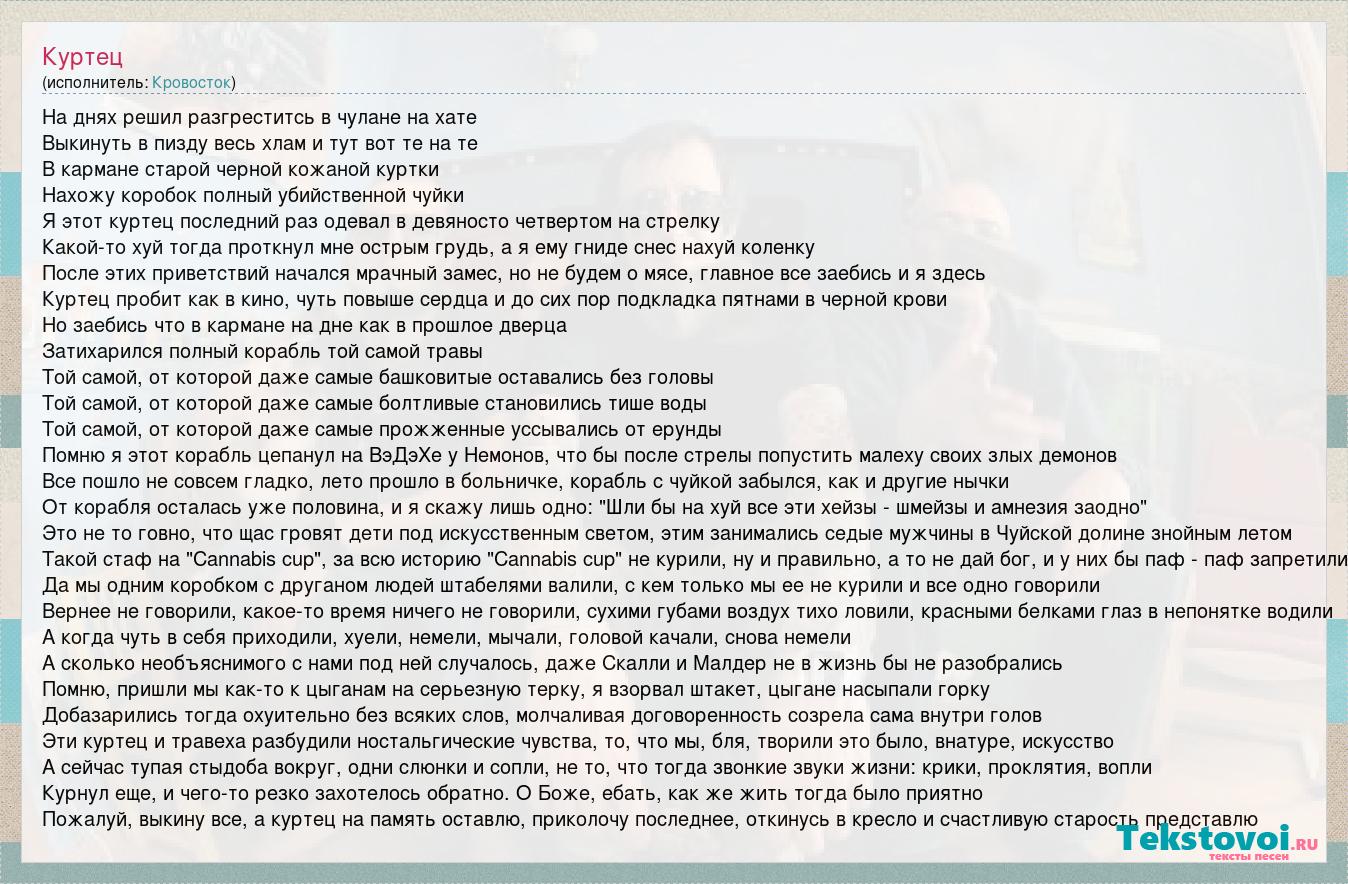 На днях решил разгреститсь в чулане на хате Выкинуть в пизду весь хлам и тут вот те на те В кармане старой черной кожаной куртки Нахожу коробок полный убийственной чуйки Я этот куртец последний раз одевал в девяносто четвертом на стрелку Какой-то хуй тогда проткнул мне острым грудь, а я ему гниде снес нахуй коленку После этих приветствий начался мрачный замес, но не будем о мясе, главное все заебись и я здесь Куртец пробит как в кино, чуть повыше сердца и до сих пор подкладка пятнами в черной крови Но заебись что в кармане на дне как в прошлое дверца Затихарился полный корабль той самой травы Той самой, от которой даже самые башковитые оставались без головы Той самой, от которой даже самые болтливые становились тише воды Той самой, от которой даже самые прожженные уссывались от ерунды Помню я этот корабль цепанул на ВэДэХе у Немонов, что бы после стрелы попустить малеху своих злых демонов Все пошло не совсем гладко, лето прошло в больничке, корабль с чуйкой забылся, как и другие нычки От корабля осталась уже половина, и я скажу лишь одно: "Шли бы на хуй все эти хейзы - шмейзы и амнезия заодно" Это не то говно, что щас гровят дети под искусственным светом, этим занимались седые мужчины в Чуйской долине знойным летом Такой стаф на "Cannabis cup", за всю историю "Cannabis cup" не курили, ну и правильно, а то не дай бог, и у них бы паф - паф запретили Да мы одним коробком с друганом людей штабелями валили, с кем только мы ее не курили и все одно говорили Вернее не говорили, какое-то время ничего не говорили, сухими губами воздух тихо ловили, красными белками глаз в непонятке водили А когда чуть в себя приходили, хуели, немели, мычали, головой качали, снова немели А сколько необъяснимого с нами под ней случалось, даже Скалли и Малдер не в жизнь бы не разобрались Помню, пришли мы как-то к цыганам на серьезную терку, я взорвал штакет, цыгане насыпали горку Добазарились тогда охуительно без всяких слов, молчаливая договоренность созрела сама внутри голов Эти куртец и травеха разбудили ностальгические чувства, то, что мы, бля, творили это было, внатуре, искусство А сейчас тупая стыдоба вокруг, одни слюнки и сопли, не то, что тогда звонкие звуки жизни: крики, проклятия, вопли Курнул еще, и чего-то резко захотелось обратно. О Боже, ебать, как же жить тогда было приятно Пожалуй, выкину все, а куртец на память оставлю, приколочу последнее, откинусь в кресло и счастливую старость представлю
