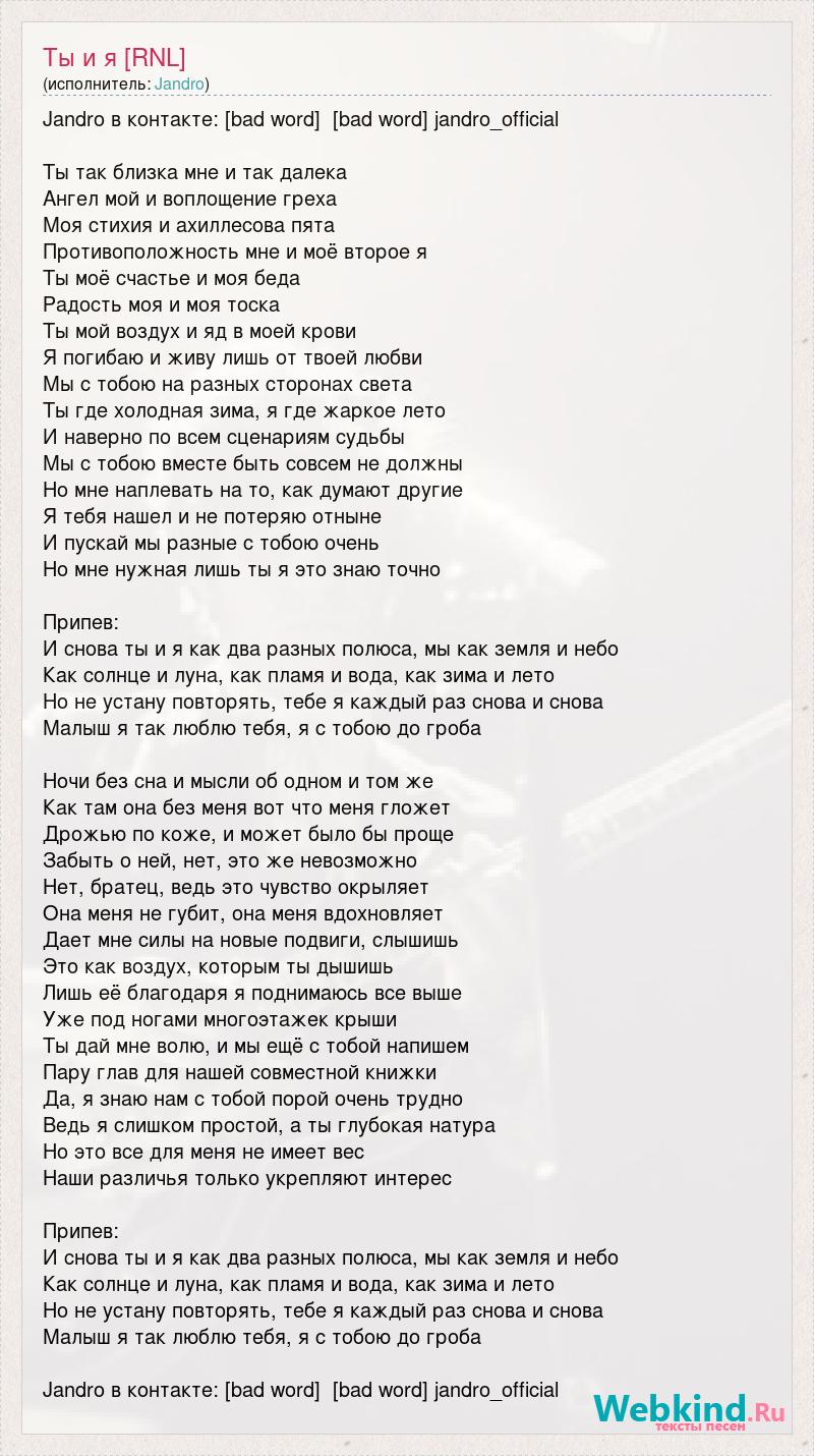Jandro в контакте: [bad word] [bad word] jandro_official Ты так близка мне и так далека Ангел мой и воплощение греха Моя стихия и ахиллесова пята Противоположность мне и моё второе я Ты моё счастье и моя беда Радость моя и моя тоска Ты мой воздух и яд в моей крови Я погибаю и живу лишь от твоей любви Мы с тобою на разных сторонах света Ты где холодная зима, я где жаркое лето И наверно по всем сценариям судьбы Мы с тобою вместе быть совсем не должны Но мне наплевать на то, как думают другие Я тебя нашел и не потеряю отныне И пускай мы разные с тобою очень Но мне нужная лишь ты я это знаю точно Припев: И снова ты и я как два разных полюса, мы как земля и небо Как солнце и луна, как пламя и вода, как зима и лето Но не устану повторять, тебе я каждый раз снова и снова Малыш я так люблю тебя, я с тобою до гроба Ночи без сна и мысли об одном и том же Как там она без меня вот что меня гложет Дрожью по коже, и может было бы проще Забыть о ней, нет, это же невозможно Нет, братец, ведь это чувство окрыляет Она меня не губит, она меня вдохновляет Дает мне силы на новые подвиги, слышишь Это как воздух, которым ты дышишь Лишь её благодаря я поднимаюсь все выше Уже под ногами многоэтажек крыши Ты дай мне волю, и мы ещё с тобой напишем Пару глав для нашей совместной книжки Да, я знаю нам с тобой порой очень трудно Ведь я слишком простой, а ты глубокая натура Но это все для меня не имеет вес Наши различья только укрепляют интерес Припев: И снова ты и я как два разных полюса, мы как земля и небо Как солнце и луна, как пламя и вода, как зима и лето Но не устану повторять, тебе я каждый раз снова и снова Малыш я так люблю тебя, я с тобою до гроба Jandro в контакте: [bad word] [bad word] jandro_official