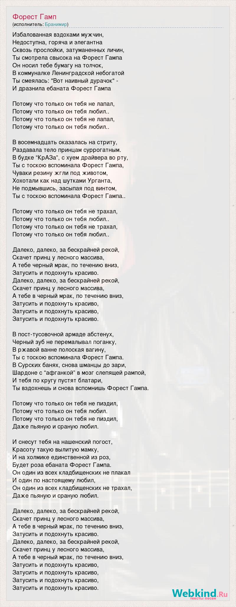 Избалованная вздохами мужчин, Недоступна, горяча и элегантна Сквозь прослойки, затуманенных личин, Ты смотрела свысока на Форест Гампа Он носил тебе бумагу на толчок, В коммуналке Ленинградской небогатой Ты смеялась: "Вот наивный дурачок" - И дразнила ебаната Форест Гампа Потому что только он тебя не лапал, Потому что только он тебя любил.. Потому что только он тебя не лапал, Потому что только он тебя любил.. В восемнадцать оказалась на стриту, Раздавала тело принцам суррогатным. В будке “КрАЗа”, с хуем драйвера во рту, Ты с тоскою вспоминала Форест Гампа, Чуваки резину жгли под животом, Хохотали как над шутками Урганта, Не подмывшись, засыпая под винтом, Ты с тоскою вспоминала Форест Гампа.. Потому что только он тебя не трахал, Потому что только он тебя любил.. Потому что только он тебя не трахал, Потому что только он тебя любил.. Далеко, далеко, за бескрайней рекой, Скачет принц у лесного массива, А тебе черный мрак, по течению вниз, Затусить и подохнуть красиво. Далеко, далеко, за бескрайней рекой, Скачет принц у лесного массива, А тебе в черный мрак, по течению вниз, Затусить и подохнуть красиво, Затусить и подохнуть красиво, Затусить и подохнуть красиво. В пост-тусовочной армаде абстенух, Черный зуб не перемалывал поганку, В ржавой ванне полоская вагину, Ты с тоскою вспоминала Форест Гампа. В Сурских банях, снова шманцы до зари, Шардоне с “афганкой” в мозг слепящей рампой, И тебя по кругу пустят блатари, Ты вздохнешь и снова вспомнишь Форест Гампа. Потому что только он тебя не пиздил, Потому что только он тебя любил. Потому что только он тебя не пиздил, Даже пьяную и сраную любил. И снесут тебя на нашенский погост, Красоту такую вылитую мамку, И на холмике единственной из роз, Будет роза ебаната Форест Гампа. Он один из всех кладбищенских не плакал И один по настоящему любил, Он один из всех кладбищенских не трахал, Даже пьяную и сраную любил. Далеко, далеко, за бескрайней рекой, Скачет принц у лесного массива, А тебе в черный мрак, по течению вниз, Затусить и подохнуть красиво. Далеко, далеко, за бескрайней рекой, Скачет принц у лесного массива, А тебе в черный мрак, по течению вниз, Затусить и подохнуть красиво, Затусить и подохнуть красиво, Затусить и подохнуть красиво, Затусить и подохнуть красиво.