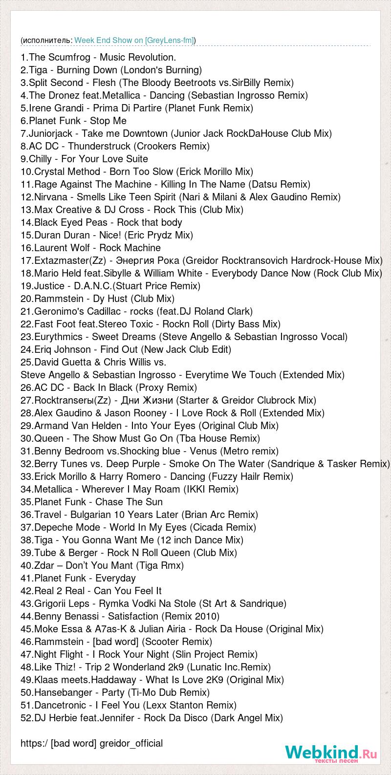 1.The Scumfrog - Music Revolution. 2.Tiga - Burning Down (London's Burning) 3.Split Second - Flesh (The Bloody Beetroots vs.SirBilly Remix) 4.The Dronez feat.Metallica - Dancing (Sebastian Ingrosso Remix) 5.Irene Grandi - Prima Di Partire (Planet Funk Remix) 6.Planet Funk - Stop Me 7.Juniorjack - Take me Downtown (Junior Jack RockDaHouse Club Mix) 8.AC DC - Thunderstruck (Crookers Remix) 9.Chilly - For Your Love Suite 10.Crystal Method - Born Too Slow (Erick Morillo Mix) 11.Rage Against The Machine - Killing In The Name (Datsu Remix) 12.Nirvana - Smells Like Teen Spirit (Nari & Milani & Alex Gaudino Remix) 13.Max Creative & DJ Cross - Rock This (Club Mix) 14.Black Eyed Peas - Rock that body 15.Duran Duran - Nice! (Eric Prydz Mix) 16.Laurent Wolf - Rock Machine 17.Extazmaster(Zz) - Энергия Рока (Greidor Rocktransovich Hardrock-House Mix) 18.Mario Held feat.Sibylle & William White - Everybody Dance Now (Rock Club Mix) 19.Justice - D.A.N.C.(Stuart Price Remix) 20.Rammstein - Dy Hust (Club Mix) 21.Geronimo's Cadillac - rocks (feat.DJ Roland Clark) 22.Fast Foot feat.Stereo Toxic - Rockn Roll (Dirty Bass Mix) 23.Eurythmics - Sweet Dreams (Steve Angello & Sebastian Ingrosso Vocal) 24.Eriq Johnson - Find Out (New Jack Club Edit) 25.David Guetta & Chris Willis vs. Steve Angello & Sebastian Ingrosso - Everytime We Touch (Extended Mix) 26.AC DC - Back In Black (Proxy Remix) 27.Rocktranserы(Zz) - Дни Жизни (Starter & Greidor Clubrock Mix) 28.Alex Gaudino & Jason Rooney - I Love Rock & Roll (Extended Mix) 29.Armand Van Helden - Into Your Eyes (Original Club Mix) 30.Queen - The Show Must Go On (Tba House Remix) 31.Benny Bedroom vs.Shocking blue - Venus (Metro remix) 32.Berry Tunes vs. Deep Purple - Smoke On The Water (Sandrique & Tasker Remix) 33.Erick Morillo & Harry Romero - Dancing (Fuzzy Hailr Remix) 34.Metallica - Wherever I May Roam (IKKI Remix) 35.Planet Funk - Chase The Sun 36.Travel - Bulgarian 10 Years Later (Brian Arc Remix) 37.Depeche Mode - World In My Eyes (Cicada Remix) 38.Tiga - You Gonna Want Me (12 inch Dance Mix) 39.Tube & Berger - Rock N Roll Queen (Club Mix) 40.Zdar – Don’t You Mant (Tiga Rmx) 41.Planet Funk - Everyday 42.Real 2 Real - Can You Feel It 43.Grigorii Leps - Rymka Vodki Na Stole (St Art & Sandrique) 44.Benny Benassi - Satisfaction (Remix 2010) 45.Moke Essa & A7as-K & Julian Airia - Rock Da House (Original Mix) 46.Rammstein - [bad word] (Scooter Remix) 47.Night Flight - I Rock Your Night (Slin Project Remix) 48.Like Thiz! - Trip 2 Wonderland 2k9 (Lunatic Inc.Remix) 49.Klaas meets.Haddaway - What Is Love 2K9 (Original Mix) 50.Hansebanger - Party (Ti-Mo Dub Remix) 51.Dancetronic - I Feel You (Lexx Stanton Remix) 52.DJ Herbie feat.Jennifer - Rock Da Disco (Dark Angel Mix) https:/ [bad word] greidor_official