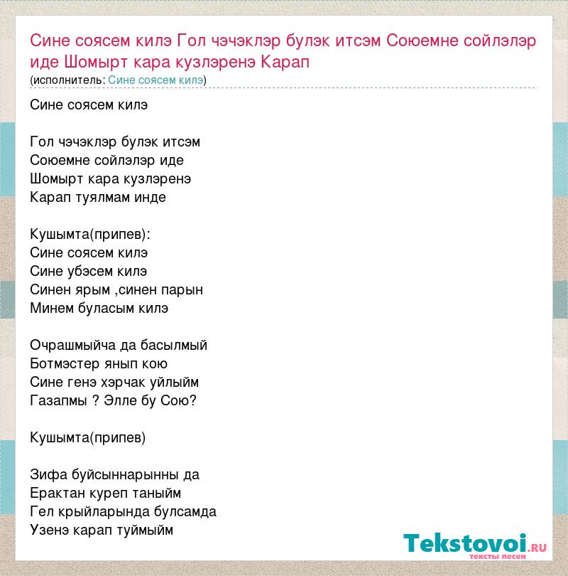 Сине соясем килэ Гол чэчэклэр булэк итсэм Союемне сойлэлэр иде Шомырт кара кузлэренэ Карап туялмам инде Кушымта(припев): Сине соясем килэ Сине убэсем килэ Синен ярым ,синен парын Минем буласым килэ Очрашмыйча да басылмый Ботмэстер янып кою Сине генэ хэрчак уйлыйм Газапмы ? Элле бу Сою? Кушымта(припев) Зифа буйсыннарынны да Ерактан куреп таныйм Гел крыйларында булсамда Узенэ карап туймыйм