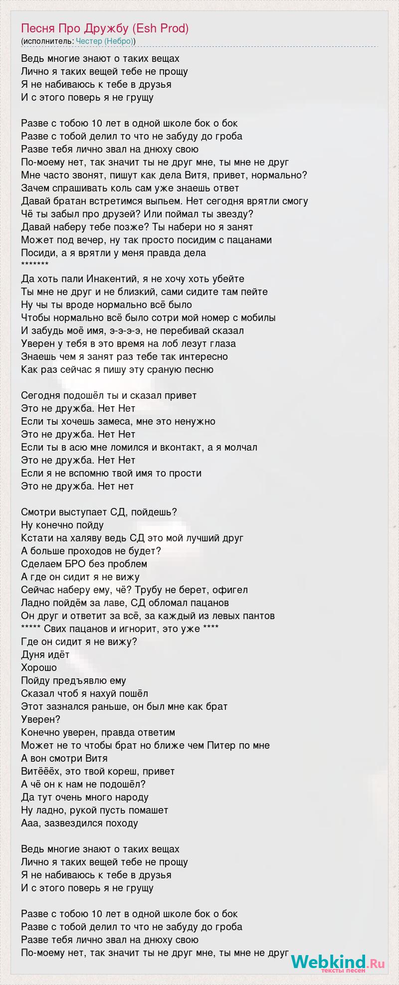 Ведь многие знают о таких вещах Лично я таких вещей тебе не прощу Я не набиваюсь к тебе в друзья И с этого поверь я не грущу Разве с тобою 10 лет в одной школе бок о бок Разве с тобой делил то что не забуду до гроба Разве тебя лично звал на днюху свою По-моему нет, так значит ты не друг мне, ты мне не друг Мне часто звонят, пишут как дела Витя, привет, нормально? Зачем спрашивать коль сам уже знаешь ответ Давай братан встретимся выпьем. Нет сегодня врятли смогу Чё ты забыл про друзей? Или поймал ты звезду? Давай наберу тебе позже? Ты набери но я занят Может под вечер, ну так просто посидим с пацанами Посиди, а я врятли у меня правда дела ******* Да хоть пали Инакентий, я не хочу хоть убейте Ты мне не друг и не близкий, сами сидите там пейте Ну чы ты вроде нормально всё было Чтобы нормально всё было сотри мой номер с мобилы И забудь моё имя, э-э-э-э, не перебивай сказал Уверен у тебя в это время на лоб лезут глаза Знаешь чем я занят раз тебе так интересно Как раз сейчас я пишу эту сраную песню Сегодня подошёл ты и сказал привет Это не дружба. Нет Нет Если ты хочешь замеса, мне это ненужно Это не дружба. Нет Нет Если ты в асю мне ломился и вконтакт, а я молчал Это не дружба. Нет Нет Если я не вспомню твой имя то прости Это не дружба. Нет нет Смотри выступает СД, пойдешь? Ну конечно пойду Кстати на халяву ведь СД это мой лучший друг А больше проходов не будет? Сделаем БРО без проблем А где он сидит я не вижу Сейчас наберу ему, чё? Трубу не берет, офигел Ладно пойдём за лаве, СД обломал пацанов Он друг и ответит за всё, за каждый из левых пантов ***** Свих пацанов и игнорит, это уже **** Где он сидит я не вижу? Дуня идёт Хорошо Пойду предъявлю ему Сказал чтоб я нахуй пошёл Этот зазнался раньше, он был мне как брат Уверен? Конечно уверен, правда ответим Может не то чтобы брат но ближе чем Питер по мне А вон смотри Витя Витёёёх, это твой кореш, привет А чё он к нам не подошёл? Да тут очень много народу Ну ладно, рукой пусть помашет Ааа, зазвездился походу Ведь многие знают о таких вещах Лично я таких вещей тебе не прощу Я не набиваюсь к тебе в друзья И с этого поверь я не грущу Разве с тобою 10 лет в одной школе бок о бок Разве с тобой делил то что не забуду до гроба Разве тебя лично звал на днюху свою По-моему нет, так значит ты не друг мне, ты мне не друг