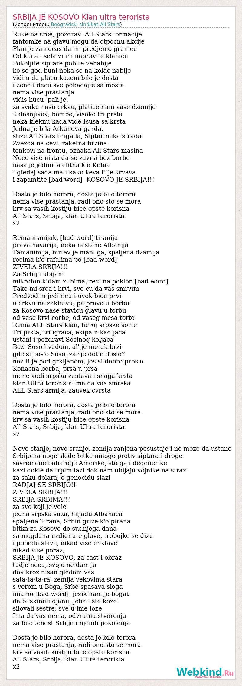 Ruke na srce, pozdravi All Stars formacije fantomke na glavu mogu da otpocnu akcije Plan je za nocas da im predjemo granicu Od kuca i sela vi im napravite klanicu Pokoljite siptare pobite vehabije ko se god buni neka se na kolac nabije vidim da placu kazem bilo je dosta i zene i decu sve pobacajte sa mosta nema vise prastanja vidis kucu- pali je, za svaku nasu crkvu, platice nam vase dzamije Kalasnjikov, bombe, visoko tri prsta neka kleknu kada vide Isusa sa krsta Jedna je bila Arkanova garda, stize All Stars brigada, Siptar neka strada Zvezda na cevi, raketna brzina tenkovi na frontu, oznaka All Stars masina Nece vise nista da se zavrsi bez borbe nasa je jedinica elitna k'o Kobre I gledaj sada mali kako keva ti je krvava i zapamtite [bad word] KOSOVO JE SRBIJA!!! Dosta je bilo horora, dosta je bilo terora nema vise prastanja, radi ono sto se mora krv sa vasih kostiju bice opste korisna All Stars, Srbija, klan Ultra terorista x2 Rema manijak, [bad word] tiranija prava havarija, neka nestane Albanija Tamanim ja, mrtav je mani ga, spaljena dzamija recima k'o rafalima po [bad word] ZIVELA SRBIJA!!! Za Srbiju ubijam mikrofon kidam zubima, reci na poklon [bad word] Tako mi srca i krvi, sve cu da vas smrvim Predvodim jedinicu i uvek bicu prvi u crkvu na zakletvu, pa pravo u borbu za Kosovo nase stavicu glavu u torbu od vase krvi corbe, od vaseg mesa torte Rema ALL Stars klan, heroj srpske sorte Tri prsta, tri igraca, ekipa nikad jaca ustani i pozdravi Sosinog koljaca Bezi Soso livadom, al' je metak brzi gde si pos'o Soso, zar je dotle doslo? noz ti je pod grkljanom, jos si dobro pros'o Konacna borba, prsa u prsa mene vodi srpska zastava i snaga krsta klan Ultra terorista ima da vas smrska ALL Stars armija, zauvek cvrsta Dosta je bilo horora, dosta je bilo terora nema vise prastanja, radi ono sto se mora krv sa vasih kostiju bice opste korisna All Stars, Srbija, klan Ultra terorista x2 Novo stanje, novo sranje, zemlja ranjena posustaje i ne moze da ustane Srbijo na noge slede bitke mnoge protiv siptara i droge savremene babaroge Amerike, sto gaji degenerike kazi dokle da trpim lazi dok nam ubijaju vojnike na strazi za saku dolara, o genocidu slazi RADJAJ SE SRBIJO!!! ZIVELA SRBIJA!!! SRBIJA SRBIMA!!! za sve koji je vole jedna srpska suza, hiljadu Albanaca spaljena Tirana, Srbin grize k'o pirana bitka za Kosovo do sudnjega dana sa megdana uzdignute glave, trobojke se dizu i pobedu slave, nikad vise enklave nikad vise poraz, SRBIJA JE KOSOVO, za cast i obraz tudje necu, svoje ne dam ja dok kroz nisan gledam vas sata-ta-ta-ra, zemlja vekovima stara s verom u Boga, Srbe spasava sloga imamo [bad word] jezik nam je bogat da bi skinuli djanu, jebali ste koze silovali sestre, sve u ime loze Ima da vas nema, odvratna stvorenja za buducnost Srbije i njenih pokolenja Dosta je bilo horora, dosta je bilo terora nema vise prastanja, radi ono sto se mora krv sa vasih kostiju bice opste korisna All Stars, Srbija, klan Ultra terorista x2