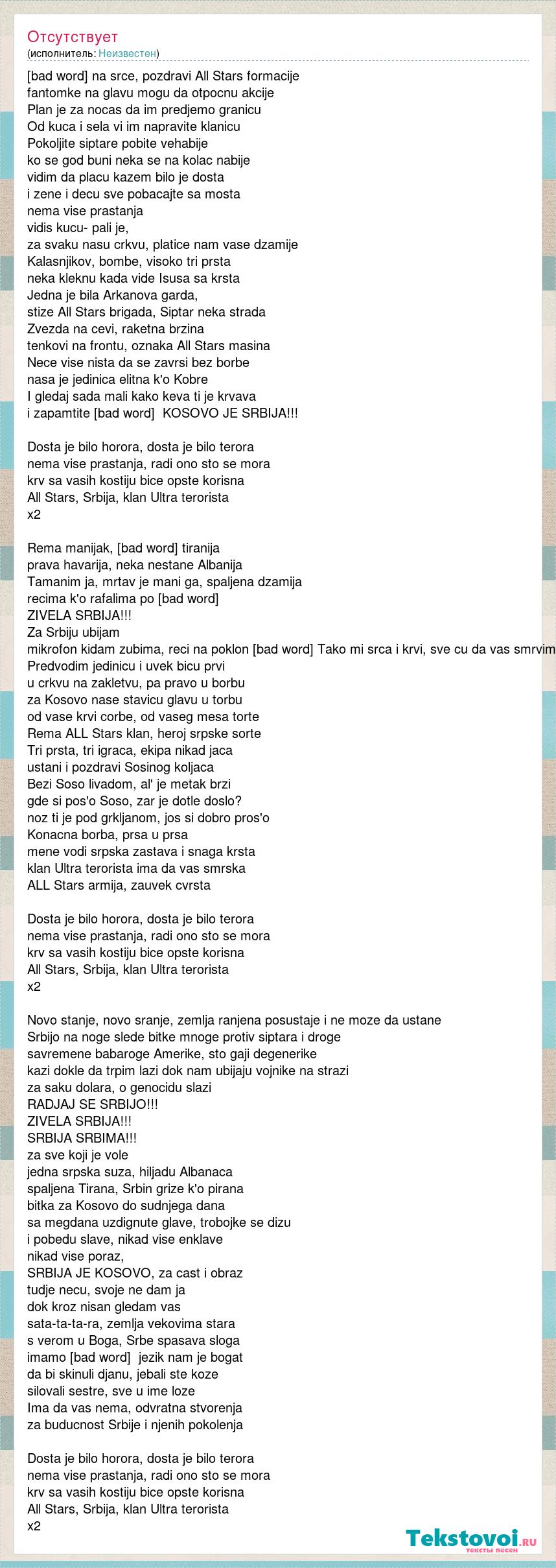 Ruke na srce, pozdravi All Stars formacije fantomke na glavu mogu da otpocnu akcije Plan je za nocas da im predjemo granicu Od kuca i sela vi im napravite klanicu Pokoljite siptare pobite vehabije ko se god buni neka se na kolac nabije vidim da placu kazem bilo je dosta i zene i decu sve pobacajte sa mosta nema vise prastanja vidis kucu- pali je, za svaku nasu crkvu, platice nam vase dzamije Kalasnjikov, bombe, visoko tri prsta neka kleknu kada vide Isusa sa krsta Jedna je bila Arkanova garda, stize All Stars brigada, Siptar neka strada Zvezda na cevi, raketna brzina tenkovi na frontu, oznaka All Stars masina Nece vise nista da se zavrsi bez borbe nasa je jedinica elitna k'o Kobre I gledaj sada mali kako keva ti je krvava i zapamtite poruku, KOSOVO JE SRBIJA!!! Dosta je bilo horora, dosta je bilo terora nema vise prastanja, radi ono sto se mora krv sa vasih kostiju bice opste korisna All Stars, Srbija, klan Ultra terorista x2 Rema manijak, brutalna tiranija prava havarija, neka nestane Albanija Tamanim ja, mrtav je mani ga, spaljena dzamija recima k'o rafalima po instrumentalima ZIVELA SRBIJA!!! Za Srbiju ubijam mikrofon kidam zubima, reci na poklon drugima Tako mi srca i krvi, sve cu da vas smrvim Predvodim jedinicu i uvek bicu prvi u crkvu na zakletvu, pa pravo u borbu za Kosovo nase stavicu glavu u torbu od vase krvi corbe, od vaseg mesa torte Rema ALL Stars klan, heroj srpske sorte Tri prsta, tri igraca, ekipa nikad jaca ustani i pozdravi Sosinog koljaca Bezi Soso livadom, al' je metak brzi gde si pos'o Soso, zar je dotle doslo? noz ti je pod grkljanom, jos si dobro pros'o Konacna borba, prsa u prsa mene vodi srpska zastava i snaga krsta klan Ultra terorista ima da vas smrska ALL Stars armija, zauvek cvrsta Dosta je bilo horora, dosta je bilo terora nema vise prastanja, radi ono sto se mora krv sa vasih kostiju bice opste korisna All Stars, Srbija, klan Ultra terorista x2 Novo stanje, novo sranje, zemlja ranjena posustaje i ne moze da ustane Srbijo na noge slede bitke mnoge protiv siptara i droge savremene babaroge Amerike, sto gaji degenerike kazi dokle da trpim lazi dok nam ubijaju vojnike na strazi za saku dolara, o genocidu slazi RADJAJ SE SRBIJO!!! ZIVELA SRBIJA!!! SRBIJA SRBIMA!!! za sve koji je vole jedna srpska suza, hiljadu Albanaca spaljena Tirana, Srbin grize k'o pirana bitka za Kosovo do sudnjega dana sa megdana uzdignute glave, trobojke se dizu i pobedu slave, nikad vise enklave nikad vise poraz, SRBIJA JE KOSOVO, za cast i obraz tudje necu, svoje ne dam ja dok kroz nisan gledam vas sata-ta-ta-ra, zemlja vekovima stara s verom u Boga, Srbe spasava sloga imamo kulturu, jezik nam je bogat da bi skinuli djanu, jebali ste koze silovali sestre, sve u ime loze Ima da vas nema, odvratna stvorenja za buducnost Srbije i njenih pokolenja Dosta je bilo horora, dosta je bilo terora nema vise prastanja, radi ono sto se mora krv sa vasih kostiju bice opste korisna All Stars, Srbija, klan Ultra terorista x2