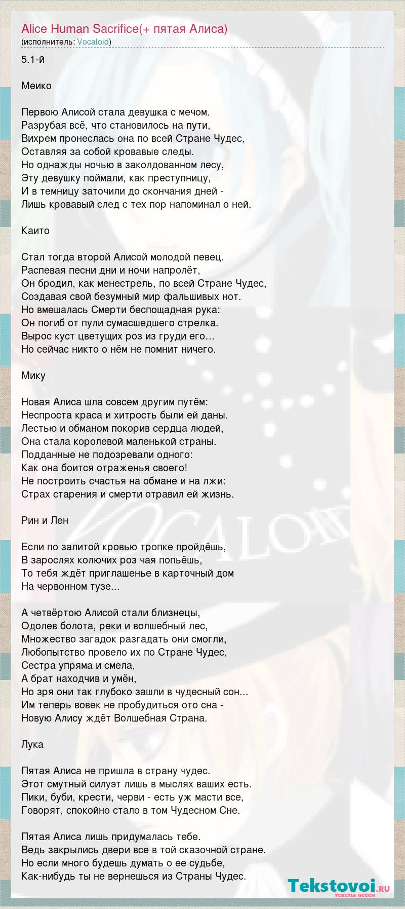 5.1-й Меико Первою Алисой стала девушка с мечом. Разрубая всё, что становилось на пути, Вихрем пронеслась она по всей Стране Чудес, Оставляя за собой кровавые следы. Но однажды ночью в заколдованном лесу, Эту девушку поймали, как преступницу, И в темницу заточили до скончания дней - Лишь кровавый след с тех пор напоминал о ней. Каито Стал тогда второй Алисой молодой певец. Распевая песни дни и ночи напролёт, Он бродил, как менестрель, по всей Стране Чудес, Создавая свой безумный мир фальшивых нот. Но вмешалась Смерти беспощадная рука: Он погиб от пули сумасшедшего стрелка. Вырос куст цветущих роз из груди его… Но сейчас никто о нём не помнит ничего. Мику Новая Алиса шла совсем другим путём: Неспроста краса и хитрость были ей даны. Лестью и обманом покорив сердца людей, Она стала королевой маленькой страны. Подданные не подозревали одного: Как она боится отраженья своего! Не построить счастья на обмане и на лжи: Страх старения и смерти отравил ей жизнь. Рин и Лен Если по залитой кровью тропке пройдёшь, В зарослях колючих роз чая попьёшь, То тебя ждёт приглашенье в карточный дом На червонном тузе... А четвёртою Алисой стали близнецы, Одолев болота, реки и волшебный лес, Множество загадок разгадать они смогли, Любопытство провело их по Стране Чудес, Сестра упряма и смела, А брат находчив и умён, Но зря они так глубоко зашли в чудесный сон... Им теперь вовек не пробудиться ото сна - Новую Алису ждёт Волшебная Страна. Лука Пятая Алиса не пришла в страну чудес. Этот смутный силуэт лишь в мыслях ваших есть. Пики, буби, крести, черви - есть уж масти все, Говорят, спокойно стало в том Чудесном Сне. Пятая Алиса лишь придумалась тебе. Ведь закрылись двери все в той сказочной стране. Но если много будешь думать о ее судьбе, Как-нибудь ты не вернешься из Страны Чудес.