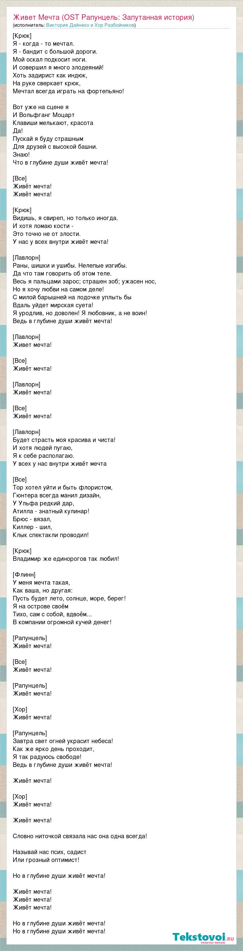 [Крюк] Я - когда - то мечтал. Я - бандит с большой дороги. Мой оскал подкосит ноги. И совершил я много злодеяний! Хоть задирист как индюк, На руке сверкает крюк, Мечтал всегда играть на фортепьяно! Вот уже на сцене я И Вольфганг Моцарт Клавиши мелькают, красота Да! Пускай я буду страшным Для друзей с высокой башни. Знаю! Что в глубине души живёт мечта! [Все] Живёт мечта! Живёт мечта! [Крюк] Видишь, я свиреп, но только иногда. И хотя ломаю кости - Это точно не от злости. У нас у всех внутри живёт мечта! [Лавлорн] Раны, шишки и ушибы. Нелепые изгибы. Да что там говорить об этом теле. Весь я пальцами зарос; страшен зоб; ужасен нос, Но я хочу любви на самом деле! С милой барышней на лодочке уплыть бы Вдаль уйдет мирская суета! Я уродлив, но доволен! Я любовник, а не воин! Ведь в глубине души живёт мечта! [Лавлорн] Живет мечта! [Все] Живёт мечта! [Лавлорн] Живёт мечта! [Все] Живёт мечта! [Лавлорн] Будет страсть моя красива и чиста! И хотя людей пугаю, Я к себе располагаю. У всех у нас внутри живёт мечта [Все] Тор хотел уйти и быть флористом, Гюнтера всегда манил дизайн, У Ульфа редкий дар, Атилла - знатный кулинар! Брюс - вязал, Киллер - шил, Клык спектакли проводил! [Крюк] Владимир же единорогов так любил! [Флинн] У меня мечта такая, Как ваша, но другая: Пусть будет лето, солнце, море, берег! Я на острове своём Тихо, сам с собой, вдвоём... В компании огромной кучей денег! [Рапунцель] Живёт мечта! [Все] Живёт мечта! [Рапунцель] Живёт мечта! [Хор] Живёт мечта! [Рапунцель] Завтра свет огней украсит небеса! Как же ярко день проходит, Я так радуюсь свободе! Ведь в глубине души живёт мечта! Живёт мечта! [Хор] Живёт мечта! Живёт мечта! Словно ниточкой связала нас она одна всегда! Называй нас псих, садист Или грозный оптимист! Но в глубине души живёт мечта! Живёт мечта! Живёт мечта! Живёт мечта! Но в глубине души живёт мечта! Но в глубине души живёт мечта!