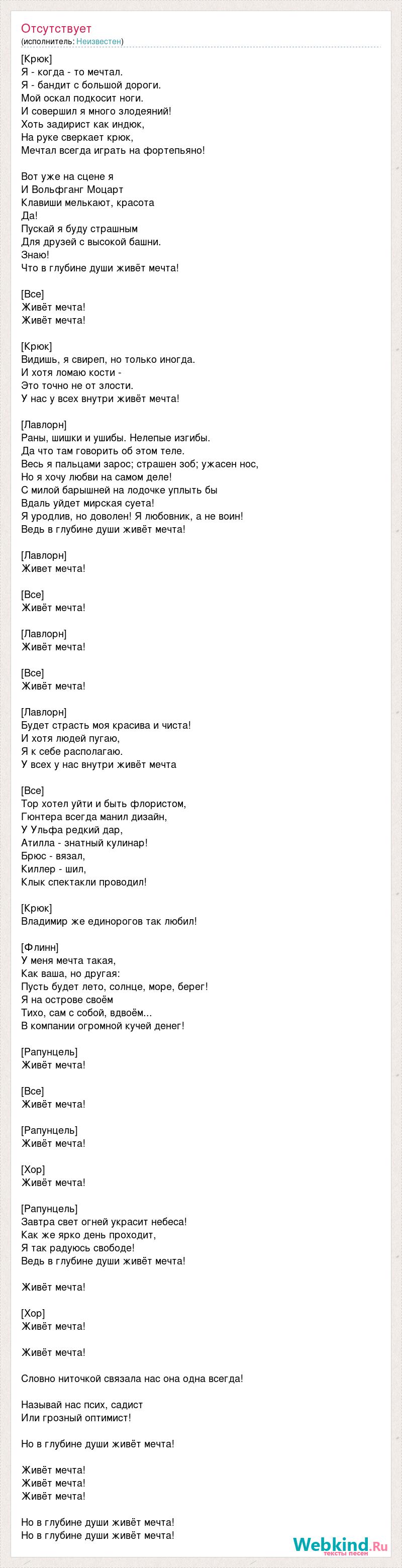 [Крюк] Я - когда - то мечтал. Я - бандит с большой дороги. Мой оскал подкосит ноги. И совершил я много злодеяний! Хоть задирист как индюк, На руке сверкает крюк, Мечтал всегда играть на фортепьяно! Вот уже на сцене я И Вольфганг Моцарт Клавиши мелькают, красота Да! Пускай я буду страшным Для друзей с высокой башни. Знаю! Что в глубине души живёт мечта! [Все] Живёт мечта! Живёт мечта! [Крюк] Видишь, я свиреп, но только иногда. И хотя ломаю кости - Это точно не от злости. У нас у всех внутри живёт мечта! [Лавлорн] Раны, шишки и ушибы. Нелепые изгибы. Да что там говорить об этом теле. Весь я пальцами зарос; страшен зоб; ужасен нос, Но я хочу любви на самом деле! С милой барышней на лодочке уплыть бы Вдаль уйдет мирская суета! Я уродлив, но доволен! Я любовник, а не воин! Ведь в глубине души живёт мечта! [Лавлорн] Живет мечта! [Все] Живёт мечта! [Лавлорн] Живёт мечта! [Все] Живёт мечта! [Лавлорн] Будет страсть моя красива и чиста! И хотя людей пугаю, Я к себе располагаю. У всех у нас внутри живёт мечта [Все] Тор хотел уйти и быть флористом, Гюнтера всегда манил дизайн, У Ульфа редкий дар, Атилла - знатный кулинар! Брюс - вязал, Киллер - шил, Клык спектакли проводил! [Крюк] Владимир же единорогов так любил! [Флинн] У меня мечта такая, Как ваша, но другая: Пусть будет лето, солнце, море, берег! Я на острове своём Тихо, сам с собой, вдвоём... В компании огромной кучей денег! [Рапунцель] Живёт мечта! [Все] Живёт мечта! [Рапунцель] Живёт мечта! [Хор] Живёт мечта! [Рапунцель] Завтра свет огней украсит небеса! Как же ярко день проходит, Я так радуюсь свободе! Ведь в глубине души живёт мечта! Живёт мечта! [Хор] Живёт мечта! Живёт мечта! Словно ниточкой связала нас она одна всегда! Называй нас псих, садист Или грозный оптимист! Но в глубине души живёт мечта! Живёт мечта! Живёт мечта! Живёт мечта! Но в глубине души живёт мечта! Но в глубине души живёт мечта!