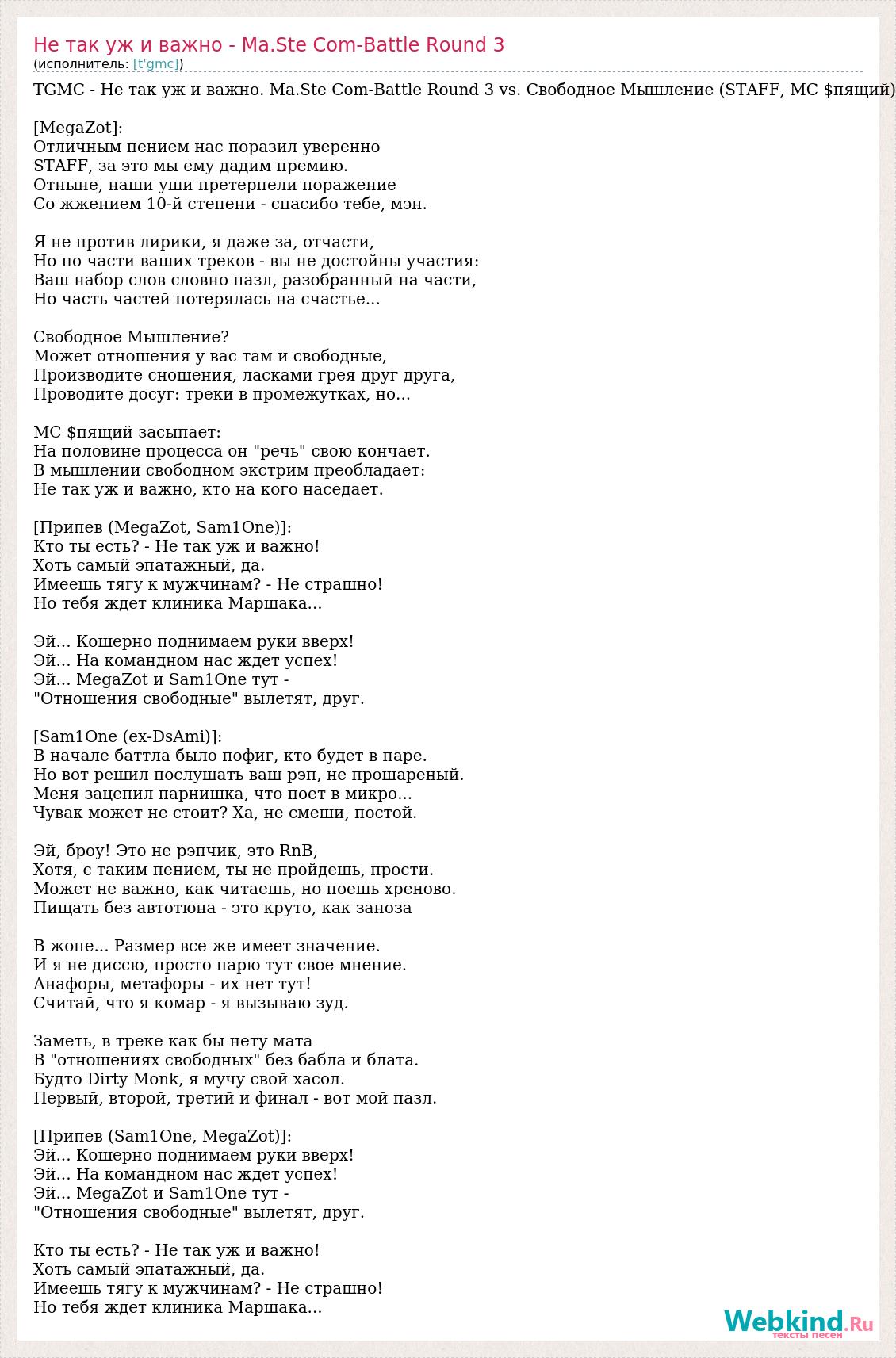 TGMC - Не так уж и важно. Ma.Ste Com-Battle Round 3 vs. Свободное Мышление (STAFF, MC $пящий) [MegaZot]: Отличным пением нас поразил уверенно STAFF, за это мы ему дадим премию. Отныне, наши уши претерпели поражение Со жжением 10-й степени - спасибо тебе, мэн. Я не против лирики, я даже за, отчасти, Но по части ваших треков - вы не достойны участия: Ваш набор слов словно пазл, разобранный на части, Но часть частей потерялась на счастье... Свободное Мышление? Может отношения у вас там и свободные, Производите сношения, ласками грея друг друга, Проводите досуг: треки в промежутках, но... MC $пящий засыпает: На половине процесса он "речь" свою кончает. В мышлении свободном экстрим преобладает: Не так уж и важно, кто на кого наседает. [Припев (MegaZot, Sam1One)]: Кто ты есть? - Не так уж и важно! Хоть самый эпатажный, да. Имеешь тягу к мужчинам? - Не страшно! Но тебя ждет клиника Маршака... Эй... Кошерно поднимаем руки вверх! Эй... На командном нас ждет успех! Эй... MegaZot и Sam1One тут - "Отношения свободные" вылетят, друг. [Sam1One (ex-DsAmi)]: В начале баттла было пофиг, кто будет в паре. Но вот решил послушать ваш рэп, не прошареный. Меня зацепил парнишка, что поет в микро... Чувак может не стоит? Ха, не смеши, постой. Эй, броу! Это не рэпчик, это RnB, Хотя, с таким пением, ты не пройдешь, прости. Может не важно, как читаешь, но поешь хреново. Пищать без автотюна - это круто, как заноза В жопе... Размер все же имеет значение. И я не диссю, просто парю тут свое мнение. Анафоры, метафоры - их нет тут! Считай, что я комар - я вызываю зуд. Заметь, в треке как бы нету мата В "отношениях свободных" без бабла и блата. Будто Dirty Monk, я мучу свой хасол. Первый, второй, третий и финал - вот мой пазл. [Припев (Sam1One, MegaZot)]: Эй... Кошерно поднимаем руки вверх! Эй... На командном нас ждет успех! Эй... MegaZot и Sam1One тут - "Отношения свободные" вылетят, друг. Кто ты есть? - Не так уж и важно! Хоть самый эпатажный, да. Имеешь тягу к мужчинам? - Не страшно! Но тебя ждет клиника Маршака...