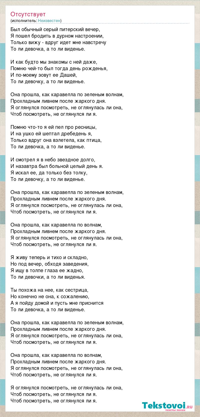 Был обычный серый питерский вечер, Я пошел бродить в дурном настроении, Только вижу - вдруг идет мне навстречу То ли девочка, а то ли виденье. И как будто мы знакомы с ней даже, Помню чей-то был тогда день рожденья, И по-моему зовут ее Дашей, То ли девочку, а то ли виденье. Она прошла, как каравелла по зеленым волнам, Прохладным ливнем после жаркого дня. Я оглянулся посмотреть, не оглянулась ли она, Чтоб посмотреть, не оглянулся ли я. Помню что-то я ей пел про ресницы, И на ушко ей шептал дребедень я, Только вдруг она взлетела, как птица, То ли девочка, а то ли виденье. И смотрел я в небо звездное долго, И назавтра был больной целый день я. Я искал ее, да только без толку, То ли девочку, а то ли виденье. Она прошла, как каравелла по зеленым волнам, Прохладным ливнем после жаркого дня. Я оглянулся посмотреть, не оглянулась ли она, Чтоб посмотреть, не оглянулся ли я. Она прошла, как каравелла по волнам, Прохладным ливнем после жаркого дня. Я оглянулся посмотреть, не оглянулась ли она, Чтоб посмотреть, не оглянулся ли я. Я живу теперь и тихо и складно, Но под вечер, обходя заведения, Я ищу в толпе глаза ее жадно, То ли девочки, а то ли виденья. Ты похожа на нее, как сестрица, Но конечно не она, к сожалению, А я пойду домой и пусть мне приснится То ли девочка, а то ли виденье. Она прошла, как каравелла по зеленым волнам, Прохладным ливнем после жаркого дня. Я оглянулся посмотреть, не оглянулась ли она, Чтоб посмотреть, не оглянулся ли я. Она прошла, как каравелла по волнам, Прохладным ливнем после жаркого дня. Я оглянулся посмотреть, не оглянулась ли она, Чтоб посмотреть, не оглянулся ли я. Я оглянулся посмотреть, не оглянулась ли она, Чтоб посмотреть, не оглянулся ли я. Чтоб посмотреть, не оглянулся ли я.