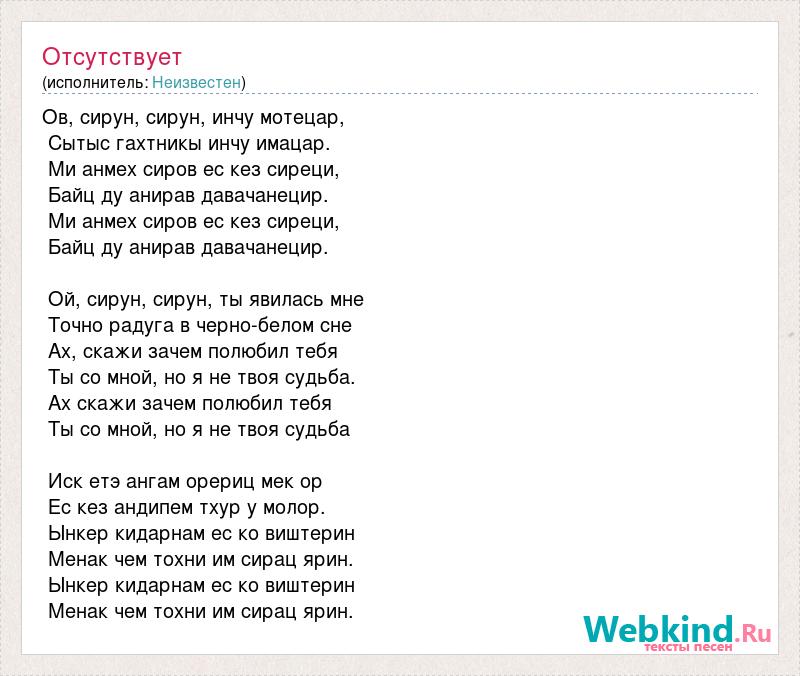 Ов, сирун, сирун, инчу мотецар, Сытыс гахтникы инчу имацар. Ми анмех сиров ес кез сиреци, Байц ду анирав давачанецир. Ми анмех сиров ес кез сиреци, Байц ду анирав давачанецир. Ой, сирун, сирун, ты явилась мне Точно радуга в черно-белом сне Ах, скажи зачем полюбил тебя Ты со мной, но я не твоя судьба. Ах скажи зачем полюбил тебя Ты со мной, но я не твоя судьба Иск етэ ангам орериц мек ор Ес кез андипем тхур у молор. Ынкер кидарнам ес ко виштерин Менак чем тохни им сирац ярин. Ынкер кидарнам ес ко виштерин Менак чем тохни им сирац ярин.