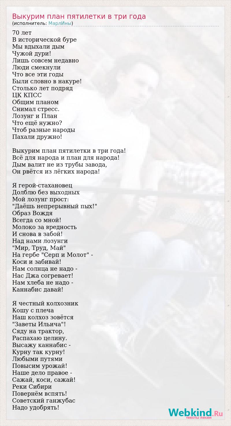 70 лет В исторической буре Мы вдыхали дым Чужой дури! Лишь совсем недавно Люди смекнули Что все эти годы Были словно в накуре! Столько лет подряд ЦК КПСС Общим планом Снимал стресс. Лозунг и План Что ещё нужно? Чтоб разные народы Пахали дружно! Выкурим план пятилетки в три года! Всё для народа и план для народа! Дым валит не из трубы завода, Он рвётся из лёгких народа! Я герой-стахановец Долблю без выходных Мой лозунг прост: "Даёшь непрерывный пых!" Образ Вождя Всегда со мной! Молоко за вредность И снова в забой! Над нами лозунги "Мир, Труд, Май" На гербе "Серп и Молот" - Коси и забивай! Нам солнца не надо - Нас Джа согревает! Нам хлеба не надо - Каннабис давай! Я честный колхозник Кошу с плеча Наш колхоз зовётся "Заветы Ильича"! Сяду на трактор, Распахаю целину. Высажу каннабис - Курну так курну! Любыми путями Повысим урожай! Наше дело правое - Сажай, коси, сажай! Реки Сибири Повернём вспять! Советский ганжубас Надо удобрять!