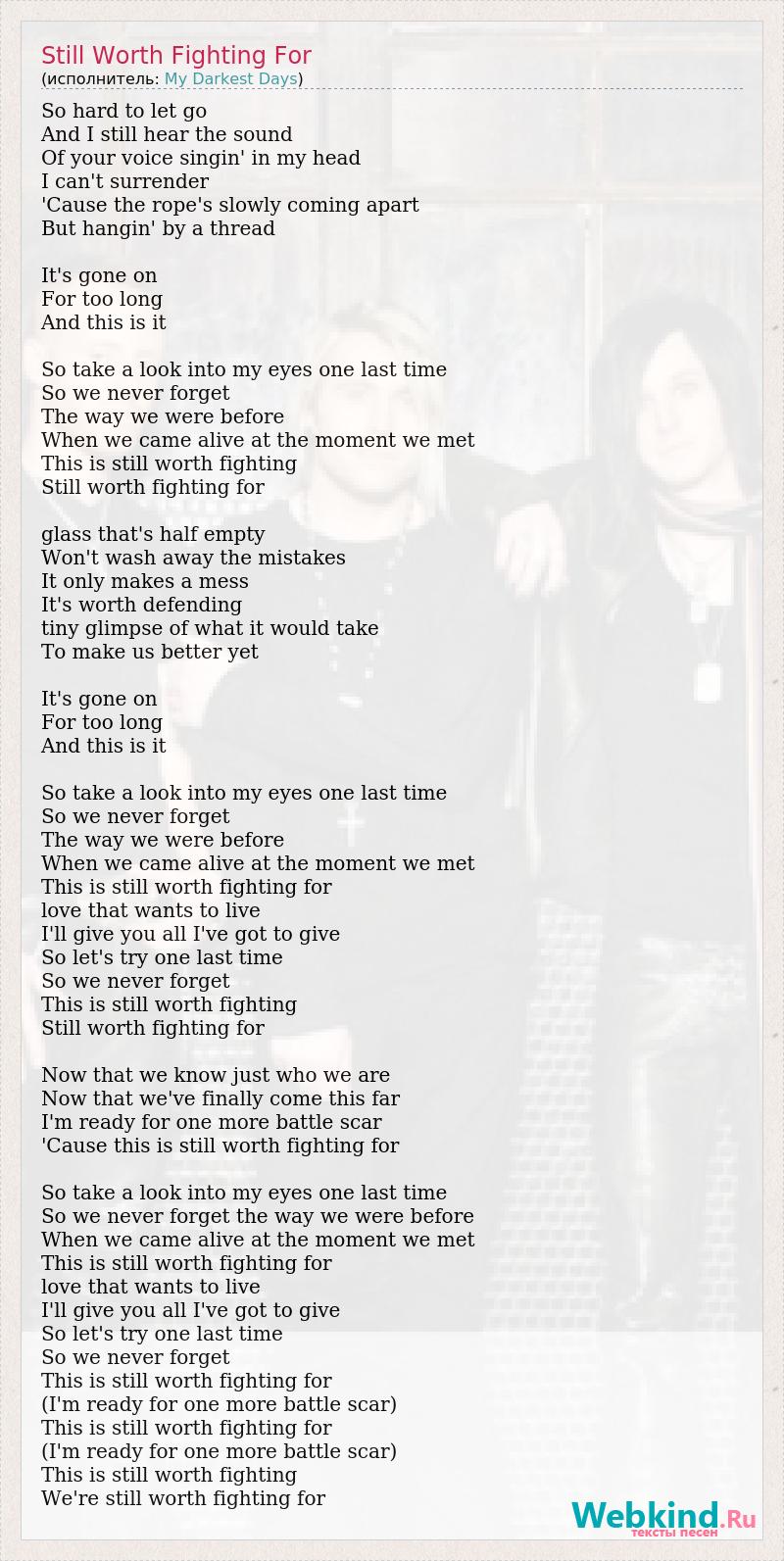 So hard to let go And I still hear the sound Of your voice singin' in my head I can't surrender 'Cause the rope's slowly coming apart But hangin' by a thread It's gone on For too long And this is it So take a look into my eyes one last time So we never forget The way we were before When we came alive at the moment we met This is still worth fighting Still worth fighting for glass that's half empty Won't wash away the mistakes It only makes a mess It's worth defending tiny glimpse of what it would take To make us better yet It's gone on For too long And this is it So take a look into my eyes one last time So we never forget The way we were before When we came alive at the moment we met This is still worth fighting for love that wants to live I'll give you all I've got to give So let's try one last time So we never forget This is still worth fighting Still worth fighting for Now that we know just who we are Now that we've finally come this far I'm ready for one more battle scar 'Cause this is still worth fighting for So take a look into my eyes one last time So we never forget the way we were before When we came alive at the moment we met This is still worth fighting for love that wants to live I'll give you all I've got to give So let's try one last time So we never forget This is still worth fighting for (I'm ready for one more battle scar) This is still worth fighting for (I'm ready for one more battle scar) This is still worth fighting We're still worth fighting for