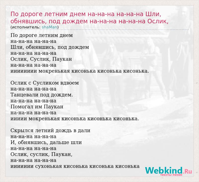 Главная→Исполнители→ShaMan→По дороге летним днем на-на-на на-на-на Шли, обнявшись, под дождем на-на-на н