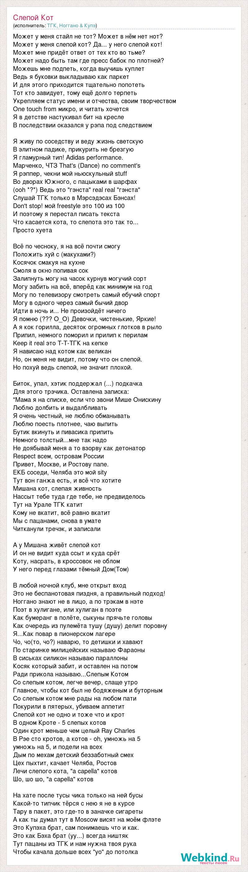 Может у меня стайл не тот? Может в нём нет нот? Может у меня слепой кот? Да... у него слепой кот! Может мне придёт ответ от тех кто во тьме? Может надо быть там где пресс бабок по плотней? Можешь мне подпеть, когда выучишь куплет Ведь я буковки выкладываю как паркет И для этого приходится тщательно попотеть Тот кто завидует, тому ещё долго терпеть Укрепляем статус имени и отчества, своим творчеством One touch from микро, и читать хочется Я в детстве настукивал бит на кресле В последствии оказался у рэпа под следствием Я живу по соседству и веду жизнь светскую В элитном падике, прикурить не брезгую Я гламурный тип! Adidas performance. Марченко, ЧТЗ That's (Dance) no comment's Я рэппер, чекни мой ньюскульный stuff Во дворах Южного, с пацыками в шарфах (ooh *?*) Ведь это "гэнста" real real "гэнста" Слушай ТГК только в Мэрсэдэсах Бэнсах! Don't stop! мой freestyle это 100 из 100 И поэтому я перестал писать текста Что касается кота, то слепота это так то... Просто хуета Всё по чесноку, я на всё почти смогу Положить хуй с (макухами?) Косячок смакуя на кухне Смоля в окно попивая сок Залипнуть могу на часок курнув могучий сорт Могу забить на всё, вперёд как минимум на год Могу по телевизору смотреть самый ебучий спорт Могу в одного через самый бычий двор Идти в ночь и... Не произойдёт ничего Я помню (??? О_О) Девочки, чистенькие, Яркие! А я кок горилла, десяток огромных глотков в рыло Припил, немного поморил и прилип к перилам Keep it real это Т-Т-ТГК на кепке Я нависаю над котом как великан Но, он меня не видит, потому что он слепой. Но похуй ведь слепой, не значит плохой. Биток, упал, хэтик поддержал (...) подкачка Для этого трэчика. Оставлена записка: "Мама я на списке, если что звони Мише Онискину Люблю долбить и выдалбливать Я очень честный, не люблю обманывать Люблю поесть плотнее, чаю выпить Бутик вкинуть и пивасика припить Немного толстый...мне так надо Не доябывай меня а то взорву как детонатор Respect всем, островам России Привет, Москве, и Ростову папе. ЕКБ соседи, Челяба это мой sity Тут вон ганжа есть, и всё что хотите Мишана кот, слепая живность Нассыт тебе туда где тебе, не предвиделось Тут на Урале ТГК катит Кому не вкатит, всё равно вкатит Мы с пацанами, снова в умате Читканули тречэк, и записали А у Мишана живёт слепой кот И он не видит куда ссыт и куда срёт Коту, насрать, в кроссовок не облом У него перед глазами тёмный Дом(Том) В любой ночной клуб, мне открыт вход Это не беспанотовая пиздня, а правильный подход! Ноггано знают не в лицо, а по трэкам в нэте Поэт в хулигане, или хулиган в поэте Как бумеранг в полёте, сыкуны прячьте головы Как очередь из пулемёта тушу (душу) делит поровну Я...Как повар в пионерском лагере Чо, чо(то, чо?) наварю, то детишки и хавают По старинке милицейских называю Фараоны В сиськах силикон называю параллоны Косяк который забит, и оставлен на потом Ради прикола называю...Слепым Котом Со слепым котом, легче вечер, слаще утро Главное, чтобы кот был не бодяженым и буторным Со слепым котом мне рады на любом пати Покурили в пятерых, убиваем аппетит Слепой кот не одно и тоже что и крот В одном Кроте - 5 слепых котов Один крот меньше чем целый Ray Charles В Рэе сто кротов, а котов - oh, умножь на 5 умножь на 5, и подели на всех Дым по мехам детский беззаботный смех Цех пыхтит, качает Челяба, Ростов Лечи слепого кота, "а сapella" котов Шо, шо шо, "a сapella" котов На хате после тусы чика только на ней бусы Какой-то типчик тёрся с нею я не в кур