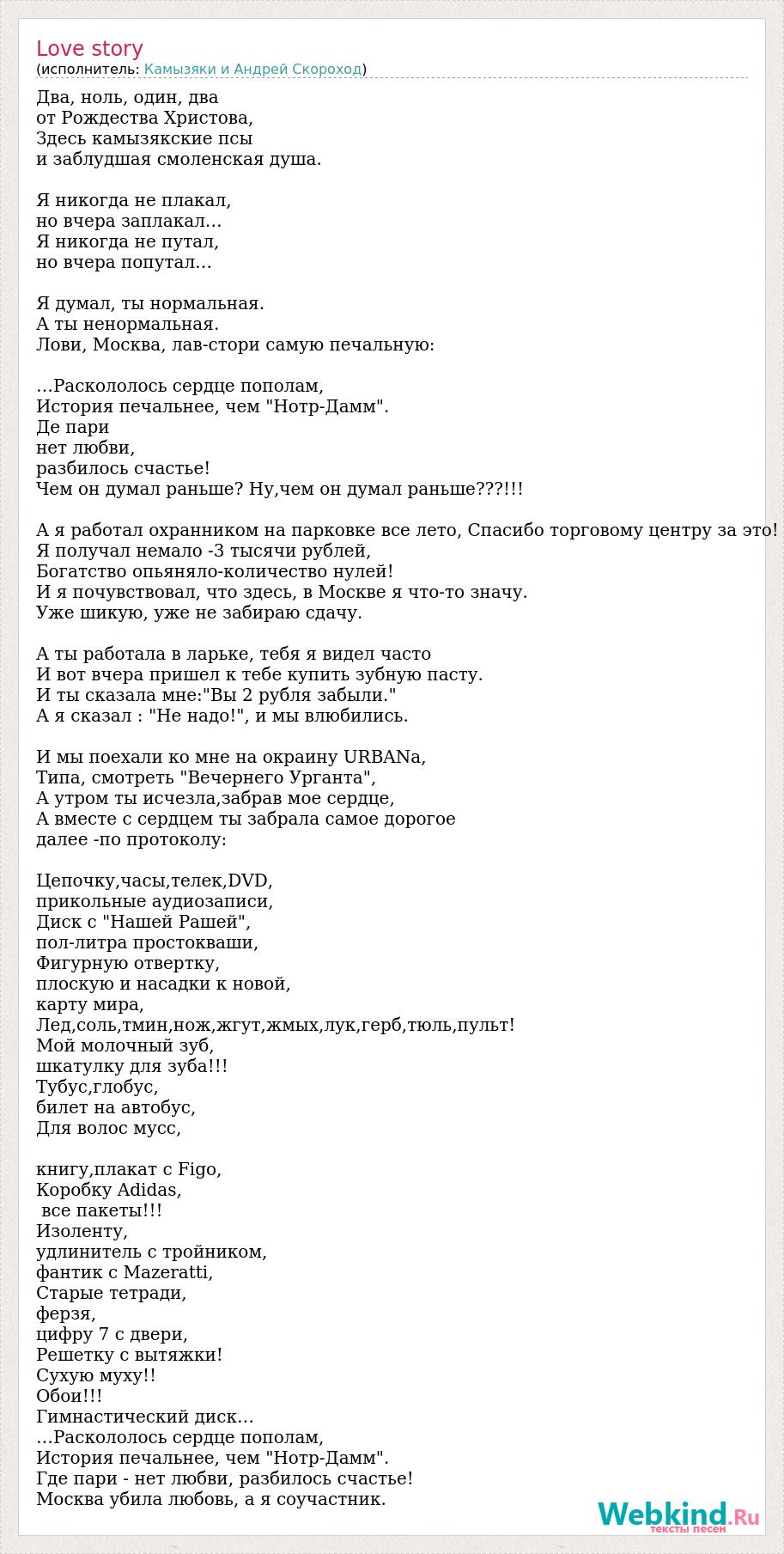 Два, ноль, один, два от Рождества Христова, Здесь камызякские псы и заблудшая смоленская душа. Я никогда не плакал, но вчера заплакал… Я никогда не путал, но вчера попутал… Я думал, ты нормальная. А ты ненормальная. Лови, Москва, лав-стори самую печальную: …Раскололось сердце пополам, История печальнее, чем "Нотр-Дамм". Де пари нет любви, разбилось счастье! Чем он думал раньше? Ну,чем он думал раньше???!!! А я работал охранником на парковке все лето, Спасибо торговому центру за это! Я получал немало -3 тысячи рублей, Богатство опьяняло-количество нулей! И я почувствовал, что здесь, в Москве я что-то значу. Уже шикую, уже не забираю сдачу. А ты работала в ларьке, тебя я видел часто И вот вчера пришел к тебе купить зубную пасту. И ты сказала мне:"Вы 2 рубля забыли." А я сказал : "Не надо!", и мы влюбились. И мы поехали ко мне на окраину URBANа, Типа, смотреть "Вечернего Урганта", А утром ты исчезла,забрав мое сердце, А вместе с сердцем ты забрала самое дорогое далее -по протоколу: Цепочку,часы,телек,DVD, прикольные аудиозаписи, Диск с "Нашей Рашей", пол-литра простокваши, Фигурную отвертку, плоскую и насадки к новой, карту мира, Лед,соль,тмин,нож,жгут,жмых,лук,герб,тюль,пульт! Мой молочный зуб, шкатулку для зуба!!! Тубус,глобус, билет на автобус, Для волос мусс, книгу,плакат с Figo, Коробку Adidas, все пакеты!!! Изоленту, удлинитель с тройником, фантик с Mazeratti, Старые тетради, ферзя, цифру 7 с двери, Решетку с вытяжки! Сухую муху!! Обои!!! Гимнастический диск… …Раскололось сердце пополам, История печальнее, чем "Нотр-Дамм". Где пари - нет любви, разбилось счастье! Москва убила любовь, а я соучастник.