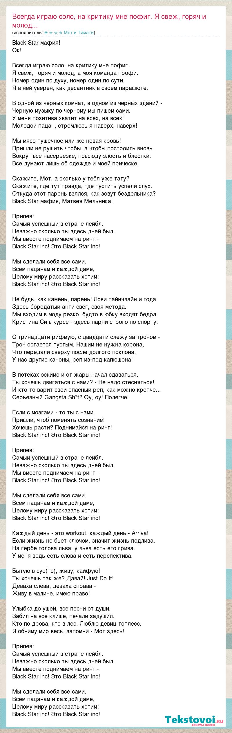 Black Star мафия! Ок! Всегда играю соло, на критику мне пофиг. Я свеж, горяч и молод, а моя команда профи. Номер один по духу, номер один по сути. Я в ней уверен, как десантник в своем парашюте. В одной из черных комнат, в одном из черных зданий - Черную музыку по черному мы пишем сами. У меня позитива хватит на всех, на всех! Молодой пацан, стремлюсь я наверх, наверх! Мы мясо пушечное или же новая кровь! Пришли не рушить чтобы, а чтобы построить вновь. Вокруг все насерьезке, повсюду злость и блестки. Все думают лишь об одежде и моей прическе. Скажите, Мот, а сколько у тебя уже тату? Скажите, где тут правда, где пустить успели слух. Откуда этот парень взялся, как зовут бездельника? Black Star мафия, Матвея Мельника! Припев: Самый успешный в стране лейбл. Неважно сколько ты здесь дней был. Мы вместе поднимаем на ринг - Black Star inс! Это Black Star inс! Мы сделали себя все сами. Всем пацанам и каждой даме, Целому миру рассказать хотим: Black Star inс! Это Black Star inс! Не будь, как камень, парень! Лови пайнчлайн и года. Здесь бородатый анти свег, своя метода. Мы входим в моду резко, будто в юбку входят бедра. Кристина Си в курсе - здесь парни строго по спорту. С тринадцати рифмую, с двадцати слежу за троном - Трон остается пустым. Нашим не нужна корона, Что передали сверху после долгого поклона. У нас другие каноны, реп из-под капюшона! В потеках эскимо и от жары начал сдаваться. Ты хочешь двигаться с нами? - Не надо стесняться! И кто-то варит свой опасный реп, как можно крепче... Серьезный Gangsta Sh*t? Оу, оу! Полегче! Если с мозгами - то ты с нами. Пришли, чтоб поменять сознание! Хочешь расти? Поднимайся на ринг! Black Star inс! Это Black Star inс! Припев: Самый успешный в стране лейбл. Неважно сколько ты здесь дней был. Мы вместе поднимаем на ринг - Black Star inс! Это Black Star inс! Мы сделали себя все сами. Всем пацанам и каждой даме, Целому миру рассказать хотим: Black Star inс! Это Black Star inс! Каждый день - это workout, каждый день - Arriva! Если жизнь не бьет ключом, значит жизнь подлива. На гербе голова льва, у льва есть его грива. У меня ведь есть слова и есть перспектива. Бытую в суе(те), живу, кайфую! Ты хочешь так же? Давай! Just Do It! Деваха слева, деваха справа - Живу в малине, имею право! Улыбка до ушей, все песни от души. Забил на все клише, печали задушил. Кто по дрова, кто в лес. Люблю девиц топлесс. Я обниму мир весь, запомни - Мот здесь! Припев: Самый успешный в стране лейбл. Неважно сколько ты здесь дней был. Мы вместе поднимаем на ринг - Black Star inс! Это Black Star inс! Мы сделали себя все сами. Всем пацанам и каждой даме, Целому миру рассказать хотим: Black Star inс! Это Black Star inс!