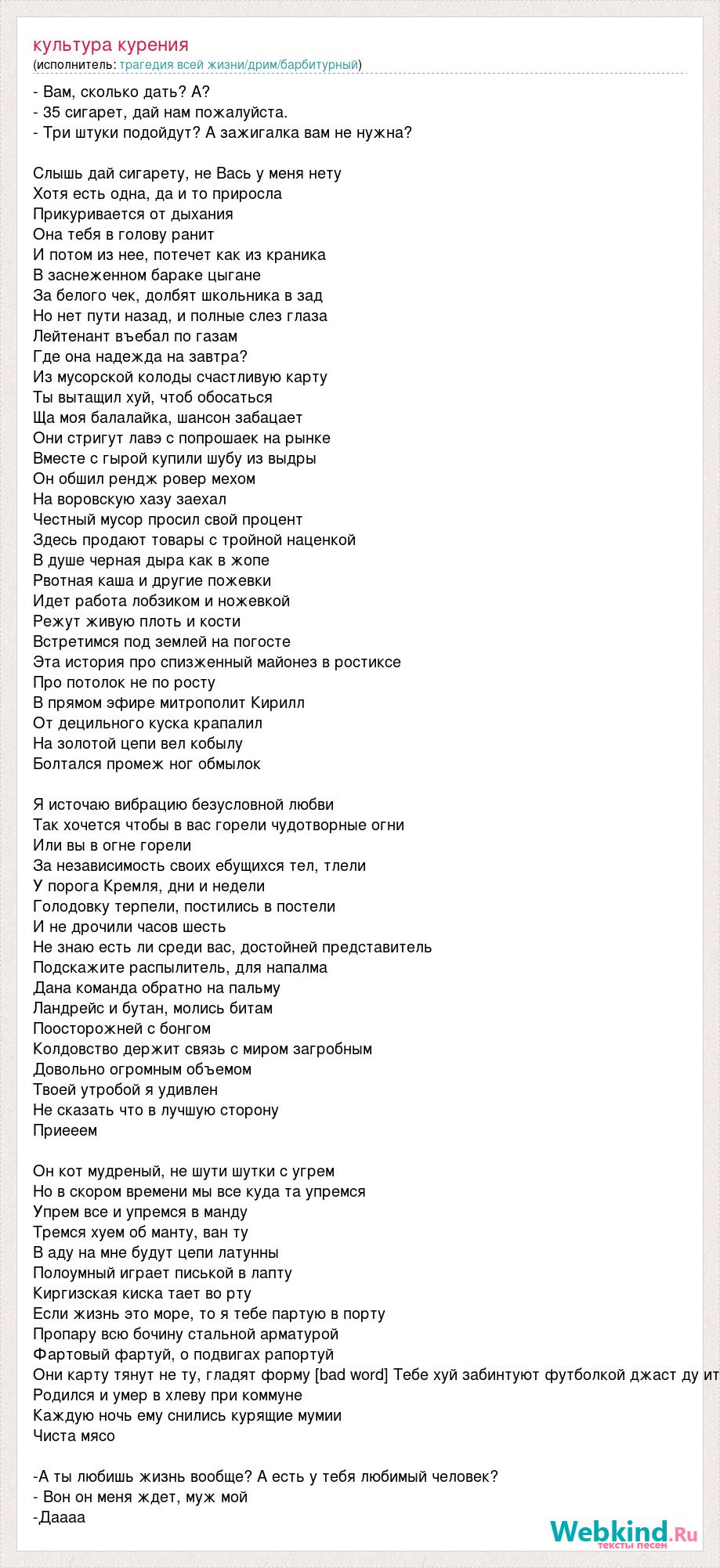 - Вам, сколько дать? А? - 35 сигарет, дай нам пожалуйста. - Три штуки подойдут? А зажигалка вам не нужна? Слышь дай сигарету, не Вась у меня нету Хотя есть одна, да и то приросла Прикуривается от дыхания Она тебя в голову ранит И потом из нее, потечет как из краника В заснеженном бараке цыгане За белого чек, долбят школьника в зад Но нет пути назад, и полные слез глаза Лейтенант въебал по газам Где она надежда на завтра? Из мусорской колоды счастливую карту Ты вытащил хуй, чтоб обосаться Ща моя балалайка, шансон забацает Они стригут лавэ с попрошаек на рынке Вместе с гырой купили шубу из выдры Он обшил рендж ровер мехом На воровскую хазу заехал Честный мусор просил свой процент Здесь продают товары с тройной наценкой В душе черная дыра как в жопе Рвотная каша и другие пожевки Идет работа лобзиком и ножевкой Режут живую плоть и кости Встретимся под землей на погосте Эта история про спизженный майонез в ростиксе Про потолок не по росту В прямом эфире митрополит Кирилл От децильного куска крапалил На золотой цепи вел кобылу Болтался промеж ног обмылок Я источаю вибрацию безусловной любви Так хочется чтобы в вас горели чудотворные огни Или вы в огне горели За независимость своих ебущихся тел, тлели У порога Кремля, дни и недели Голодовку терпели, постились в постели И не дрочили часов шесть Не знаю есть ли среди вас, достойней представитель Подскажите распылитель, для напалма Дана команда обратно на пальму Ландрейс и бутан, молись битам Поосторожней с бонгом Колдовство держит связь с миром загробным Довольно огромным объемом Твоей утробой я удивлен Не сказать что в лучшую сторону Приееем Он кот мудреный, не шути шутки с угрем Но в скором времени мы все куда та упремся Упрем все и упремся в манду Тремся хуем об манту, ван ту В аду на мне будут цепи латунны Полоумный играет писькой в лапту Киргизская киска тает во рту Если жизнь это море, то я тебе партую в порту Пропару всю бочину стальной арматурой Фартовый фартуй, о подвигах рапортуй Они карту тянут не ту, гладят форму [bad word] Тебе хуй забинтуют футболкой джаст ду ит Родился и умер в хлеву при коммуне Каждую ночь ему снились курящие мумии Чиста мясо -А ты любишь жизнь вообще? А есть у тебя любимый человек? - Вон он меня ждет, муж мой -Даааа