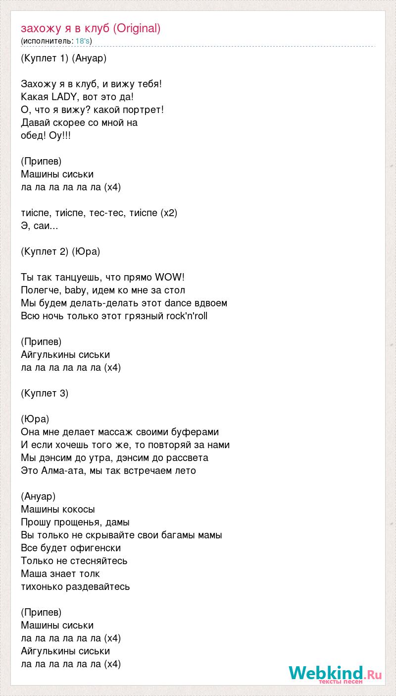(Куплет 1) (Ануар) Захожу я в клуб, и вижу тебя! Какая LADY, вот это да! О, что я вижу? какой портрет! Давай скорее со мной на обед! Оу!!! (Припев) Машины сиськи ла ла ла ла ла ла (x4) тиiспе, тиiспе, тес-тес, тиiспе (x2) Э, саи... (Куплет 2) (Юра) Ты так танцуешь, что прямо WOW! Полегче, baby, идем ко мне за стол Мы будем делать-делать этот dance вдвоем Всю ночь только этот грязный rock'n'roll (Припев) Айгулькины сиськи ла ла ла ла ла ла (x4) (Куплет 3) (Юра) Она мне делает массаж своими буферами И если хочешь того же, то повторяй за нами Мы дэнсим до утра, дэнсим до рассвета Это Алма-ата, мы так встречаем лето (Ануар) Машины кокосы Прошу прощенья, дамы Вы только не скрывайте свои багамы мамы Все будет офигенски Только не стесняйтесь Маша знает толк тихонько раздевайтесь (Припев) Машины сиськи ла ла ла ла ла ла (x4) Айгулькины сиськи ла ла ла ла ла ла (x4)