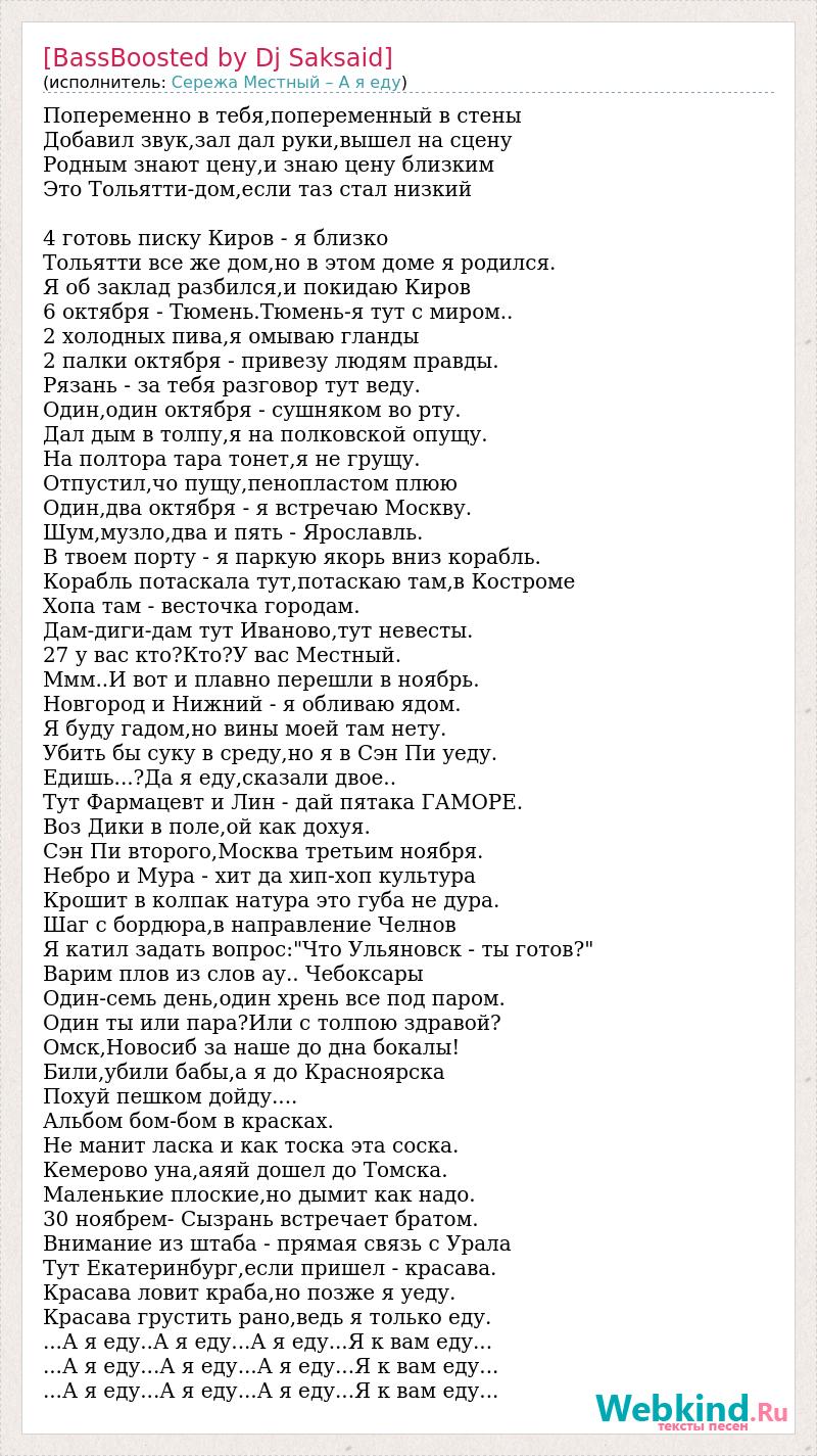 Попеременно в тебя,попеременный в стены Добавил звук,зал дал руки,вышел на сцену Родным знают цену,и знаю цену близким Это Тольятти-дом,если таз стал низкий 4 готовь писку Киров - я близко Тольятти все же дом,но в этом доме я родился. Я об заклад разбился,и покидаю Киров 6 октября - Тюмень.Тюмень-я тут с миром.. 2 холодных пива,я омываю гланды 2 палки октября - привезу людям правды. Рязань - за тебя разговор тут веду. Один,один октября - сушняком во рту. Дал дым в толпу,я на полковской опущу. На полтора тара тонет,я не грущу. Отпустил,чо пущу,пенопластом плюю Один,два октября - я встречаю Москву. Шум,музло,два и пять - Ярославль. В твоем порту - я паркую якорь вниз корабль. Корабль потаскала тут,потаскаю там,в Костроме Хопа там - весточка городам. Дам-диги-дам тут Иваново,тут невесты. 27 у вас кто?Кто?У вас Местный. Ммм..И вот и плавно перешли в ноябрь. Новгород и Нижний - я обливаю ядом. Я буду гадом,но вины моей там нету. Убить бы суку в среду,но я в Сэн Пи уеду. Едишь...?Да я еду,сказали двое.. Тут Фармацевт и Лин - дай пятака ГАМОРЕ. Воз Дики в поле,ой как дохуя. Сэн Пи второго,Москва третьим ноября. Небро и Мура - хит да хип-хоп культура Крошит в колпак натура это губа не дура. Шаг с бордюра,в направление Челнов Я катил задать вопрос:"Что Ульяновск - ты готов?" Варим плов из слов ау.. Чебоксары Один-семь день,один хрень все под паром. Один ты или пара?Или с толпою здравой? Омск,Новосиб за наше до дна бокалы! Били,убили бабы,а я до Красноярска Похуй пешком дойду.... Альбом бом-бом в красках. Не манит ласка и как тоска эта соска. Кемерово уна,аяяй дошел до Томска. Маленькие плоские,но дымит как надо. 30 ноябрем- Сызрань встречает братом. Внимание из штаба - прямая связь с Урала Тут Екатеринбург,если пришел - красава. Красава ловит краба,но позже я уеду. Красава грустить рано,ведь я только еду. ...А я еду..А я еду...А я еду...Я к вам еду... ...А я еду...А я еду...А я еду...Я к вам еду... ...А я еду...А я еду...А я еду...Я к вам еду...