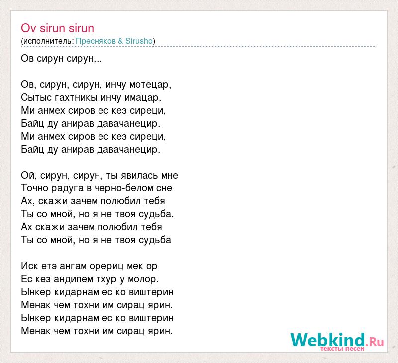 Ов сирун сирун... Ов, сирун, сирун, инчу мотецар, Сытыс гахтникы инчу имацар. Ми анмех сиров ес кез сиреци, Байц ду анирав давачанецир. Ми анмех сиров ес кез сиреци, Байц ду анирав давачанецир. Ой, сирун, сирун, ты явилась мне Точно радуга в черно-белом сне Ах, скажи зачем полюбил тебя Ты со мной, но я не твоя судьба. Ах скажи зачем полюбил тебя Ты со мной, но я не твоя судьба Иск етэ ангам орериц мек ор Ес кез андипем тхур у молор. Ынкер кидарнам ес ко виштерин Менак чем тохни им сирац ярин. Ынкер кидарнам ес ко виштерин Менак чем тохни им сирац ярин.