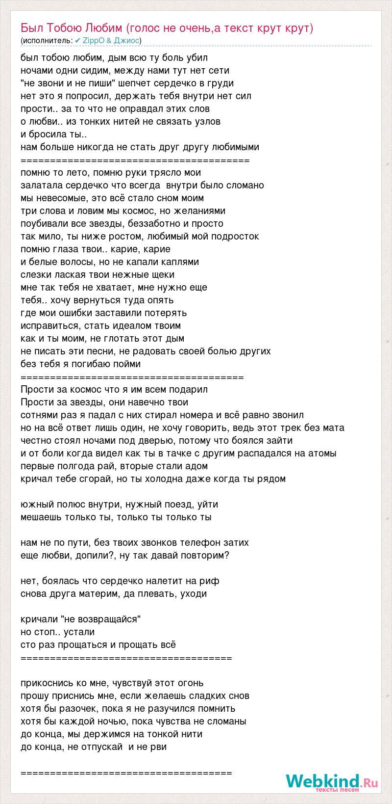 был тобою любим, дым всю ту боль убил ночами одни сидим, между нами тут нет сети "не звони и не пиши" шепчет сердечко в груди нет это я попросил, держать тебя внутри нет сил прости.. за то что не оправдал этих слов о любви.. из тонких нитей не связать узлов и бросила ты.. нам больше никогда не стать друг другу любимыми ======================================= помню то лето, помню руки трясло мои залатала сердечко что всегда внутри было сломано мы невесомые, это всё стало сном моим три слова и ловим мы космос, но желаниями поубивали все звезды, беззаботно и просто так мило, ты ниже ростом, любимый мой подросток помню глаза твои.. карие, карие и белые волосы, но не капали каплями слезки лаская твои нежные щеки мне так тебя не хватает, мне нужно еще тебя.. хочу вернуться туда опять где мои ошибки заставили потерять исправиться, стать идеалом твоим как и ты моим, не глотать этот дым не писать эти песни, не радовать своей болью других без тебя я погибаю пойми ====================================== Прости за космос что я им всем подарил Прости за звезды, они навечно твои сотнями раз я падал с них стирал номера и всё равно звонил но на всё ответ лишь один, не хочу говорить, ведь этот трек без мата честно стоял ночами под дверью, потому что боялся зайти и от боли когда видел как ты в тачке с другим распадался на атомы первые полгода рай, вторые стали адом кричал тебе сгорай, но ты холодна даже когда ты рядом южный полюс внутри, нужный поезд, уйти мешаешь только ты, только ты только ты нам не по пути, без твоих звонков телефон затих еще любви, допили?, ну так давай повторим? нет, боялась что сердечко налетит на риф снова друга материм, да плевать, уходи кричали "не возвращайся" но стоп.. устали сто раз прощаться и прощать всё ==================================== прикоснись ко мне, чувствуй этот огонь прошу приснись мне, если желаешь сладких снов хотя бы разочек, пока я не разучился помнить хотя бы каждой ночью, пока чувства не сломаны до конца, мы держимся на тонкой нити до конца, не отпускай и не рви ====================================