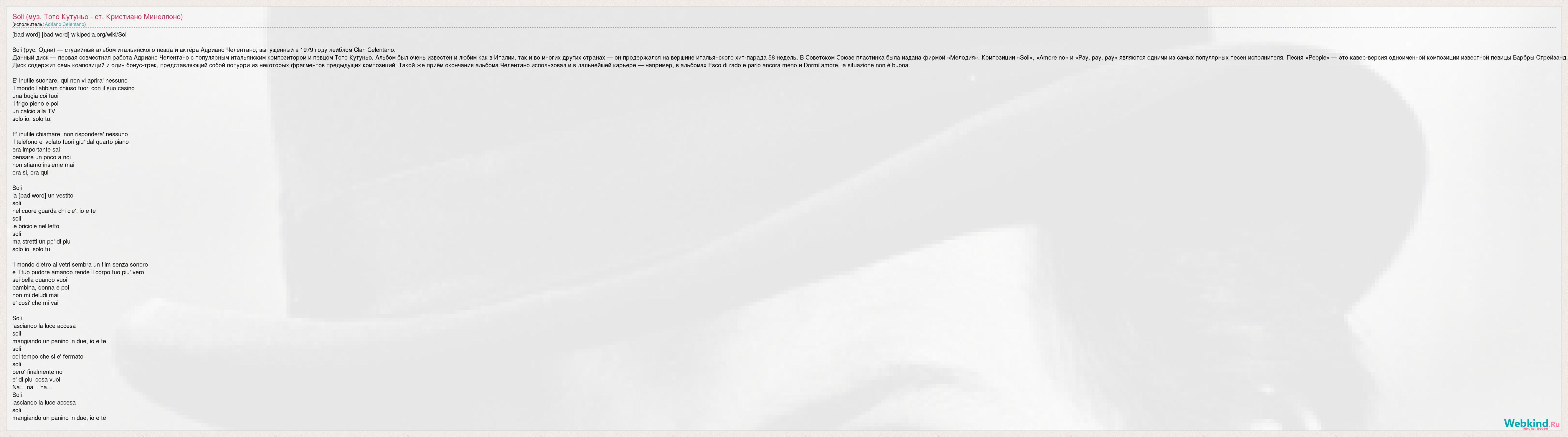 [bad word] [bad word] wikipedia.org/wiki/Soli Soli (рус. Одни) — студийный альбом итальянского певца и актёра Адриано Челентано, выпущенный в 1979 году лейблом Clan Celentano. Данный диск — первая совместная работа Адриано Челентано с популярным итальянским композитором и певцом Тото Кутуньо. Альбом был очень известен и любим как в Италии, так и во многих других странах — он продержался на вершине итальянского хит-парада 58 недель. В Советском Союзе пластинка была издана фирмой «Мелодия». Композиции «Soli», «Amore no» и «Pay, pay, pay» являются одними из самых популярных песен исполнителя. Песня «People» — это кавер-версия одноименной композиции известной певицы Барбры Стрейзанд. Диск содержит семь композиций и один бонус-трек, представляющий собой попурри из некоторых фрагментов предыдущих композиций. Такой же приём окончания альбома Челентано использовал и в дальнейшей карьере — например, в альбомах Esco di rado e parlo ancora meno и Dormi amore, la situazione non è buona. E' inutile suonare, qui non vi aprira' nessuno il mondo l'abbiam chiuso fuori con il suo casino una bugia coi tuoi il frigo pieno e poi un calcio alla TV solo io, solo tu. E' inutile chiamare, non rispondera' nessuno il telefono e' volato fuori giu' dal quarto piano era importante sai pensare un poco a noi non stiamo insieme mai ora si, ora qui Soli la [bad word] un vestito soli nel cuore guarda chi c'e': io e te soli le briciole nel letto soli ma stretti un po' di piu' solo io, solo tu il mondo dietro ai vetri sembra un film senza sonoro e il tuo pudore amando rende il corpo tuo piu' vero sei bella quando vuoi bambina, donna e poi non mi deludi mai e' cosi' che mi vai Soli lasciando la luce accesa soli mangiando un panino in due, io e te soli col tempo che si e' fermato soli pero' finalmente noi e' di piu' cosa vuoi Na... na... na... Soli lasciando la luce accesa soli mangiando un panino in due, io e te