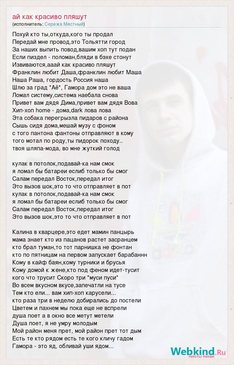 Похуй кто ты,откуда,кого ты продал Передай мне провод,это Тольятти город За наших выпить повод,вашим хоп тут подан Если пиздел - поломан,бляди в бэхе стонут Извиваются,ааай как красиво пляшут Франклин любит Даша,франклин любит Маша Наша Раша, гордость Россия наша Шлю за град *Аё*, Гамора дом это не ваша Ломал систему,система наебала снова Привет вам дядя Дима,привет вам дядя Вова Хип-хоп homе - дома,dark лова лова Эта собака перегрызла пидаров с района Сышь сидя дома,мешай музу с фоном с того пантона фантоны отправляют в кому того мотал по роду,ты пидорок походу.. твоя шляпа-мода, во мне жуткий голод кулак в потолок,подавай-ка нам смок я ломал бы батареи еслиб только бы смог Салам передал Восток,передал итог Это вызов шок,это то что отправляет в пот кулак в потолок,подавай-ка нам смок я ломал бы батареи еслиб только бы смог Салам передал Восток,передал итог Это вызов шок,это то что отправляет в пот Калина в кварцере,это едет мамин панцырь мама знает кто из пацанов растет засранцем кто брал туман,то тот парнишка не фонтан кто по пятницам на первом запускает барабаннн Кому в кайф баян,кому турники и брусья Кому домой к жене,кто под феном идет-тусит кого что трусит Скоро три *муси пуси* Во всем вкусном вкусе,запечатли на тусе Тем кто ели... вам хип-хоп карусели... кто раза три в неделю добирались до постели Цветем и пахнем мы пока еще не вспрели душа поет а в окно все метут метели Душа поет, я не умру молодым Мой район меня прет, мой район прет тот дым Есть те кто рядом есть те кого кличу гадом Гамора - это яд, обливай уши ядом...