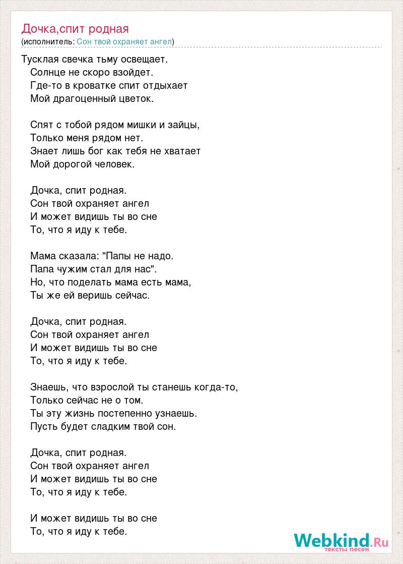 Тусклая свечка тьму освещает. Солнце не скоро взойдет. Где-то в кроватке спит отдыхает Мой драгоценный цветок. Спят с тобой рядом мишки и зайцы, Только меня рядом нет. Знает лишь бог как тебя не хватает Мой дорогой человек. Дочка, спит родная. Сон твой охраняет ангел И может видишь ты во сне То, что я иду к тебе. Мама сказала: "Папы не надо. Папа чужим стал для нас". Но, что поделать мама есть мама, Ты же ей веришь сейчас. Дочка, спит родная. Сон твой охраняет ангел И может видишь ты во сне То, что я иду к тебе. Знаешь, что взрослой ты станешь когда-то, Только сейчас не о том. Ты эту жизнь постепенно узнаешь. Пусть будет сладким твой сон. Дочка, спит родная. Сон твой охраняет ангел И может видишь ты во сне То, что я иду к тебе. И может видишь ты во сне То, что я иду к тебе.