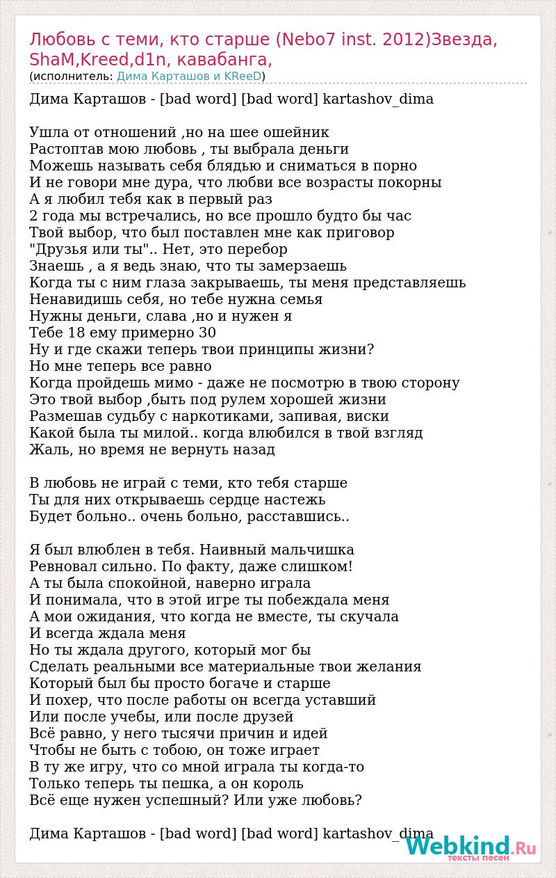 Дима Карташов - [bad word] [bad word] kartashov_dima Ушла от отношений ,но на шее ошейник Растоптав мою любовь , ты выбрала деньги Можешь называть себя блядью и сниматься в порно И не говори мне дура, что любви все возрасты покорны А я любил тебя как в первый раз 2 года мы встречались, но все прошло будто бы час Твой выбор, что был поставлен мне как приговор "Друзья или ты".. Нет, это перебор Знаешь , а я ведь знаю, что ты замерзаешь Когда ты с ним глаза закрываешь, ты меня представляешь Ненавидишь себя, но тебе нужна семья Нужны деньги, слава ,но и нужен я Тебе 18 ему примерно 30 Ну и где скажи теперь твои принципы жизни? Но мне теперь все равно Когда пройдешь мимо - даже не посмотрю в твою сторону Это твой выбор ,быть под рулем хорошей жизни Размешав судьбу с наркотиками, запивая, виски Какой была ты милой.. когда влюбился в твой взгляд Жаль, но время не вернуть назад В любовь не играй с теми, кто тебя старше Ты для них открываешь сердце настежь Будет больно.. очень больно, расставшись.. Я был влюблен в тебя. Наивный мальчишка Ревновал сильно. По факту, даже слишком! А ты была спокойной, наверно играла И понимала, что в этой игре ты побеждала меня А мои ожидания, что когда не вместе, ты скучала И всегда ждала меня Но ты ждала другого, который мог бы Сделать реальными все материальные твои желания Который был бы просто богаче и старше И похер, что после работы он всегда уставший Или после учебы, или после друзей Всё равно, у него тысячи причин и идей Чтобы не быть с тобою, он тоже играет В ту же игру, что со мной играла ты когда-то Только теперь ты пешка, а он король Всё еще нужен успешный? Или уже любовь? Дима Карташов - [bad word] [bad word] kartashov_dima