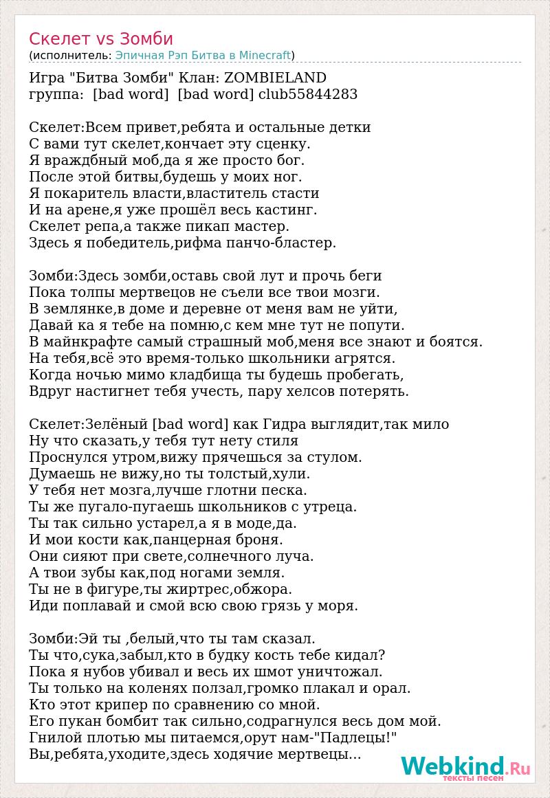 Игра "Битва Зомби" Клан: ZOMBIELAND группа: [bad word] [bad word] club55844283 Скелет:Всем привет,ребята и остальные детки С вами тут скелет,кончает эту сценку. Я враждбный моб,да я же просто бог. После этой битвы,будешь у моих ног. Я покаритель власти,властитель стасти И на арене,я уже прошёл весь кастинг. Скелет репа,а также пикап мастер. Здесь я победитель,рифма панчо-бластер. Зомби:Здесь зомби,оставь свой лут и прочь беги Пока толпы мертвецов не съели все твои мозги. В землянке,в доме и деревне от меня вам не уйти, Давай ка я тебе на помню,с кем мне тут не попути. В майнкрафте самый страшный моб,меня все знают и боятся. На тебя,всё это время-только школьники агрятся. Когда ночью мимо кладбища ты будешь пробегать, Вдруг настигнет тебя учесть, пару хелсов потерять. Скелет:Зелёный [bad word] как Гидра выглядит,так мило Ну что сказать,у тебя тут нету стиля Проснулся утром,вижу прячешься за стулом. Думаешь не вижу,но ты толстый,хули. У тебя нет мозга,лучше глотни песка. Ты же пугало-пугаешь школьников с утреца. Ты так сильно устарел,а я в моде,да. И мои кости как,панцерная броня. Они сияют при свете,солнечного луча. А твои зубы как,под ногами земля. Ты не в фигуре,ты жиртрес,обжора. Иди поплавай и смой всю свою грязь у моря. Зомби:Эй ты ,белый,что ты там сказал. Ты что,сука,забыл,кто в будку кость тебе кидал? Пока я нубов убивал и весь их шмот уничтожал. Ты только на коленях ползал,громко плакал и орал. Кто этот крипер по сравнению со мной. Его пукан бомбит так сильно,содрагнулся весь дом мой. Гнилой плотью мы питаемся,орут нам-"Падлецы!" Вы,ребята,уходите,здесь ходячие мертвецы...