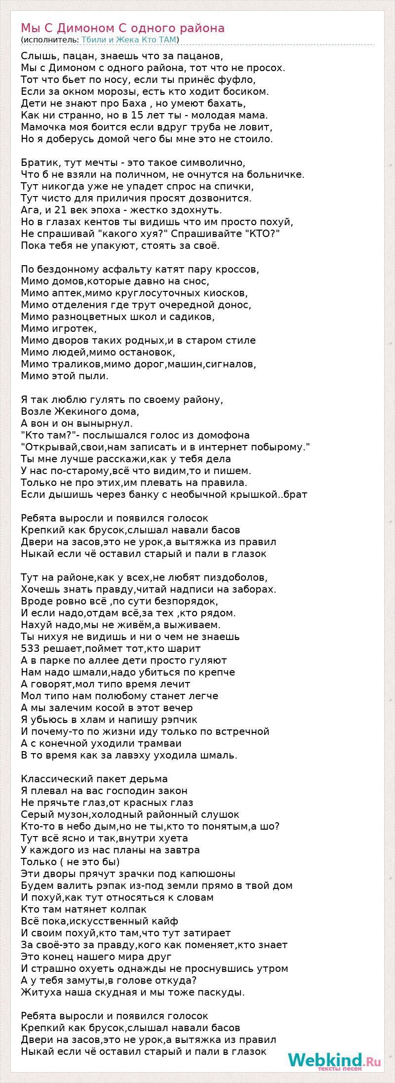 Слышь, пацан, знаешь что за пацанов, Мы с Димоном с одного района, тот что не просох. Тот что бьет по носу, если ты принёс фуфло, Если за окном морозы, есть кто ходит босиком. Дети не знают про Баха , но умеют бахать, Как ни странно, но в 15 лет ты - молодая мама. Мамочка моя боится если вдруг труба не ловит, Но я доберусь домой чего бы мне это не стоило. Братик, тут мечты - это такое символично, Что б не взяли на поличном, не очнутся на больничке. Тут никогда уже не упадет спрос на спички, Тут чисто для приличия просят дозвонится. Ага, и 21 век эпоха - жестко здохнуть. Но в глазах кентов ты видишь что им просто похуй, Не спрашивай "какого хуя?" Спрашивайте "КТО?" Пока тебя не упакуют, стоять за своё. По бездонному асфальту катят пару кроссов, Мимо домов,которые давно на снос, Мимо аптек,мимо круглосуточных киосков, Мимо отделения где трут очередной донос, Мимо разноцветных школ и садиков, Мимо игротек, Мимо дворов таких родных,и в старом стиле Мимо людей,мимо остановок, Мимо траликов,мимо дорог,машин,сигналов, Мимо этой пыли. Я так люблю гулять по своему району, Возле Жекиного дома, А вон и он вынырнул. "Кто там?"- послышался голос из домофона "Открывай,свои,нам записать и в интернет побырому." Ты мне лучше расскажи,как у тебя дела У нас по-старому,всё что видим,то и пишем. Только не про этих,им плевать на правила. Если дышишь через банку с необычной крышкой..брат Ребята выросли и появился голосок Крепкий как брусок,слышал навали басов Двери на засов,это не урок,а вытяжка из правил Ныкай если чё оставил старый и пали в глазок Тут на районе,как у всех,не любят пиздоболов, Хочешь знать правду,читай надписи на заборах. Вроде ровно всё ,по сути безпорядок, И если надо,отдам всё,за тех ,кто рядом. Нахуй надо,мы не живём,а выживаем. Ты нихуя не видишь и ни о чем не знаешь 533 решает,поймет тот,кто шарит А в парке по аллее дети просто гуляют Нам надо шмали,надо убиться по крепче А говорят,мол типо время лечит Мол типо нам полюбому станет легче А мы залечим косой в этот вечер Я убьюсь в хлам и напишу рэпчик И почему-то по жизни иду только по встречной А с конечной уходили трамваи В то время как за лавэху уходила шмаль. Классический пакет дерьма Я плевал на вас господин закон Не прячьте глаз,от красных глаз Серый музон,холодный районный слушок Кто-то в небо дым,но не ты,кто то понятым,а шо? Тут всё ясно и так,внутри хуета У каждого из нас планы на завтра Только ( не это бы) Эти дворы прячут зрачки под капюшоны Будем валить рэпак из-под земли прямо в твой дом И похуй,как тут относяться к словам Кто там натянет колпак Всё пока,искусственный кайф И своим похуй,кто там,что тут затирает За своё-это за правду,кого как поменяет,кто знает Это конец нашего мира друг И страшно охуеть однажды не проснувшись утром А у тебя замуты,в голове откуда? Житуха наша скудная и мы тоже паскуды. Ребята выросли и появился голосок Крепкий как брусок,слышал навали басов Двери на засов,это не урок,а вытяжка из правил Ныкай если чё оставил старый и пали в глазок
